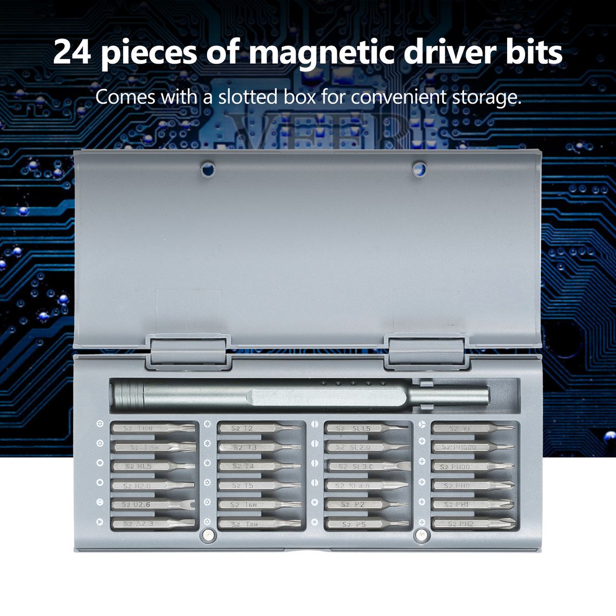 LED Light amp; Storage Case -- The front end of the three LED close lighting to offer users a comfort use at ease even in the dark environment. Comes with 24 pieces of magnetic driver bits, and a slotted box for convenient storage.