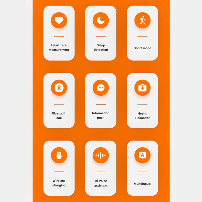 - Function:Bluetooth call, 5 menu styles, 200+ watch faces, Breathing exercises, Custom dials, Stopwatch, Brightness adjustment, Multi-sport mode, Sleep tracking, Heart rate tracking, Notification push, Real-time weather, Search phone ( use with a mobile phone connected), Bluetooth music play, Calculator, Split-screen display, Quick shortcut, Voice assistant, Alarm clock, Power saving mode,
