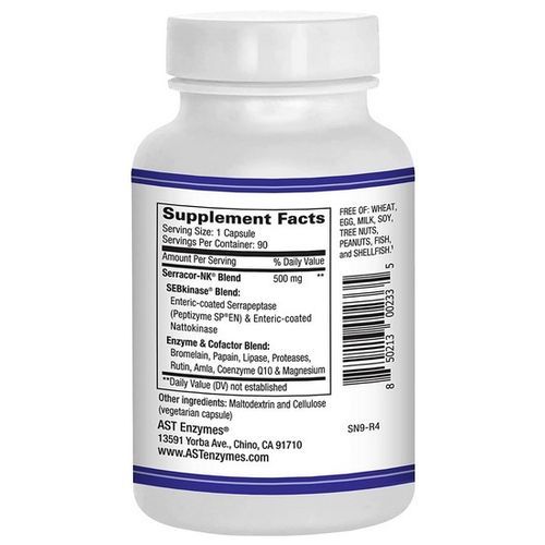 Serracor-NK is free of pesticides, chemicals, preservatives, animal derivatives, dairy, yeast, fish or shellfish, peanuts, and tree nuts. All individual enzymes are kosher-certified ingredients, and suitable for vegetarians and vegans.