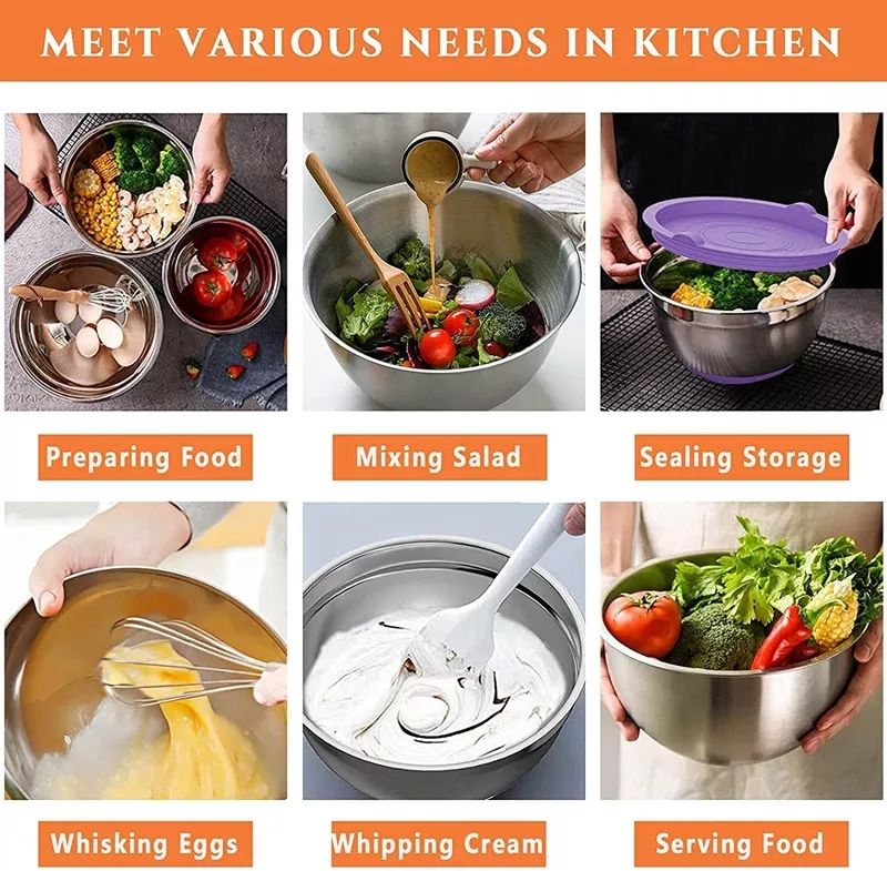 Our refrigerator- and freezer-safe kitchen bowls are simple to clean by hand and are dishwasher safe! Ideal for your different needs, such as making salads, mixing dessert, baking batters, food preparation, whisking eggs, vegetables and fruit storage,etc.