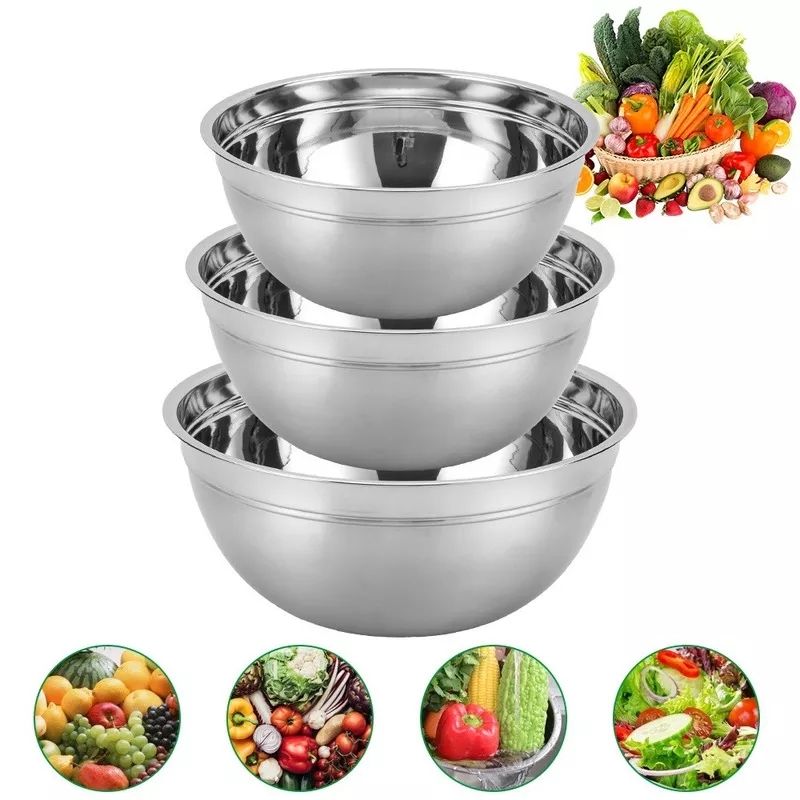 Made of heavy-gauge stainless steel, these dent- and rust-resistant mixing bowl set are sanitary, never retaining odors, bacteria, or stains. The silver bowls feature a shiny interior and fingerprint-proof satin exterior, a wide, flat rim for smooth pouring, and a flat base for stability.The mixing bowls can be stacked in kitchen or on counter, they can save the space and make the kitchen or counter to be tidy. You can manage the space efficiently.