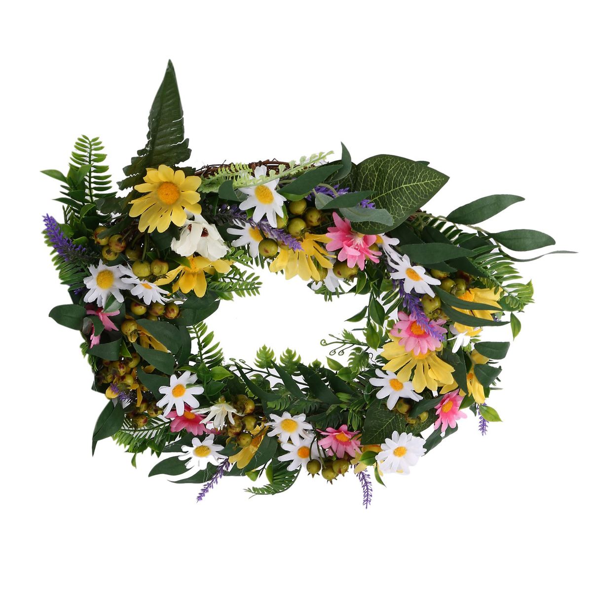 [Full and lifelike]- This spring and summer artificial wreath is full of colorful flowers, such as daisies and lavender. There are also many green eucalyptus willow leaves and fern stems and clusters of white berries to make this wreath more realistic.