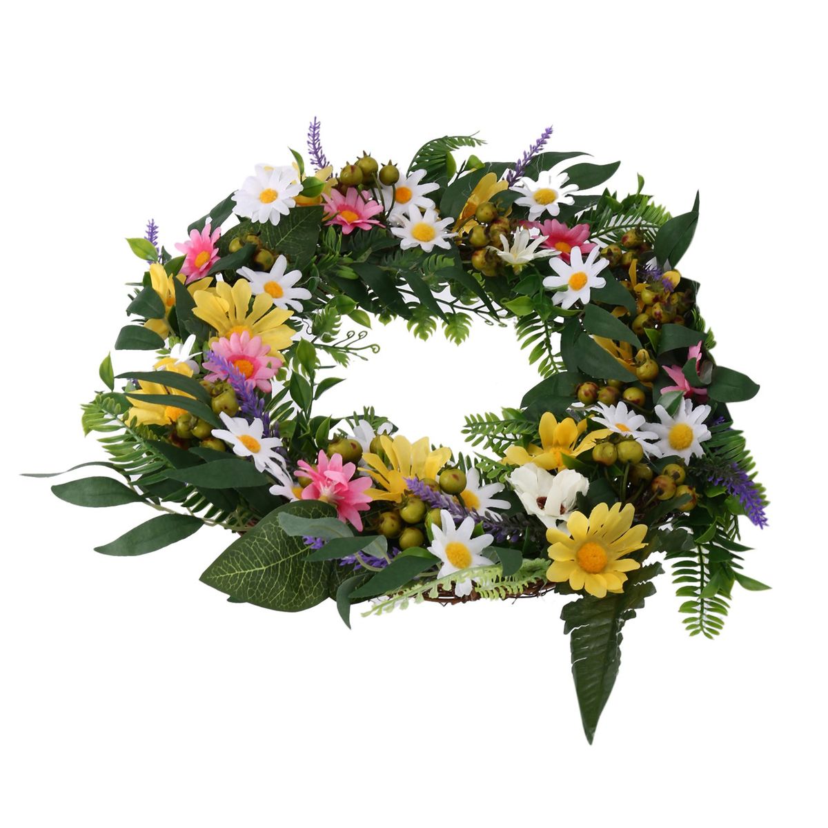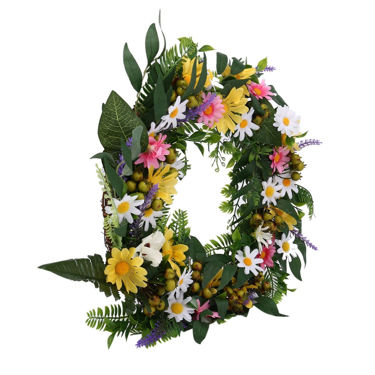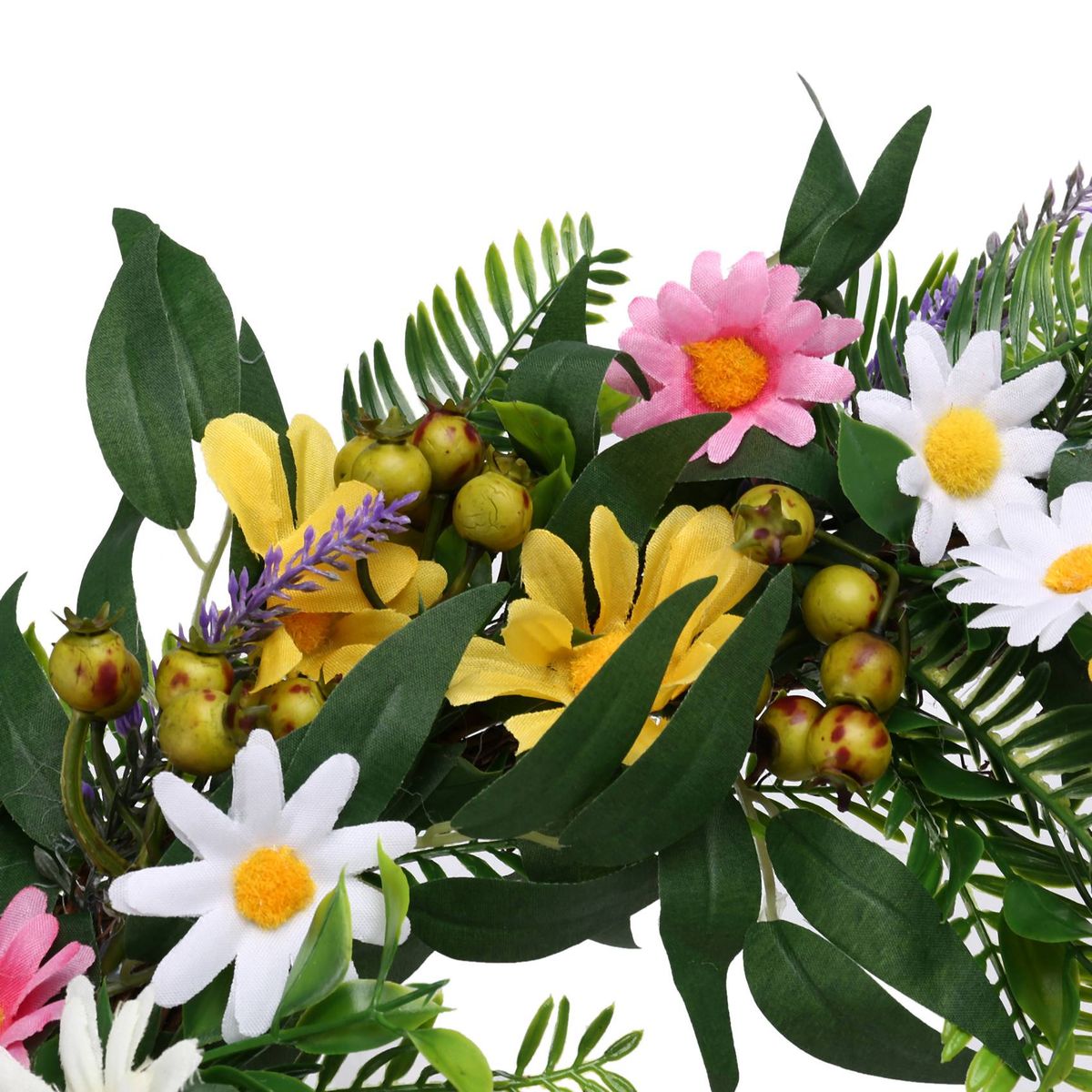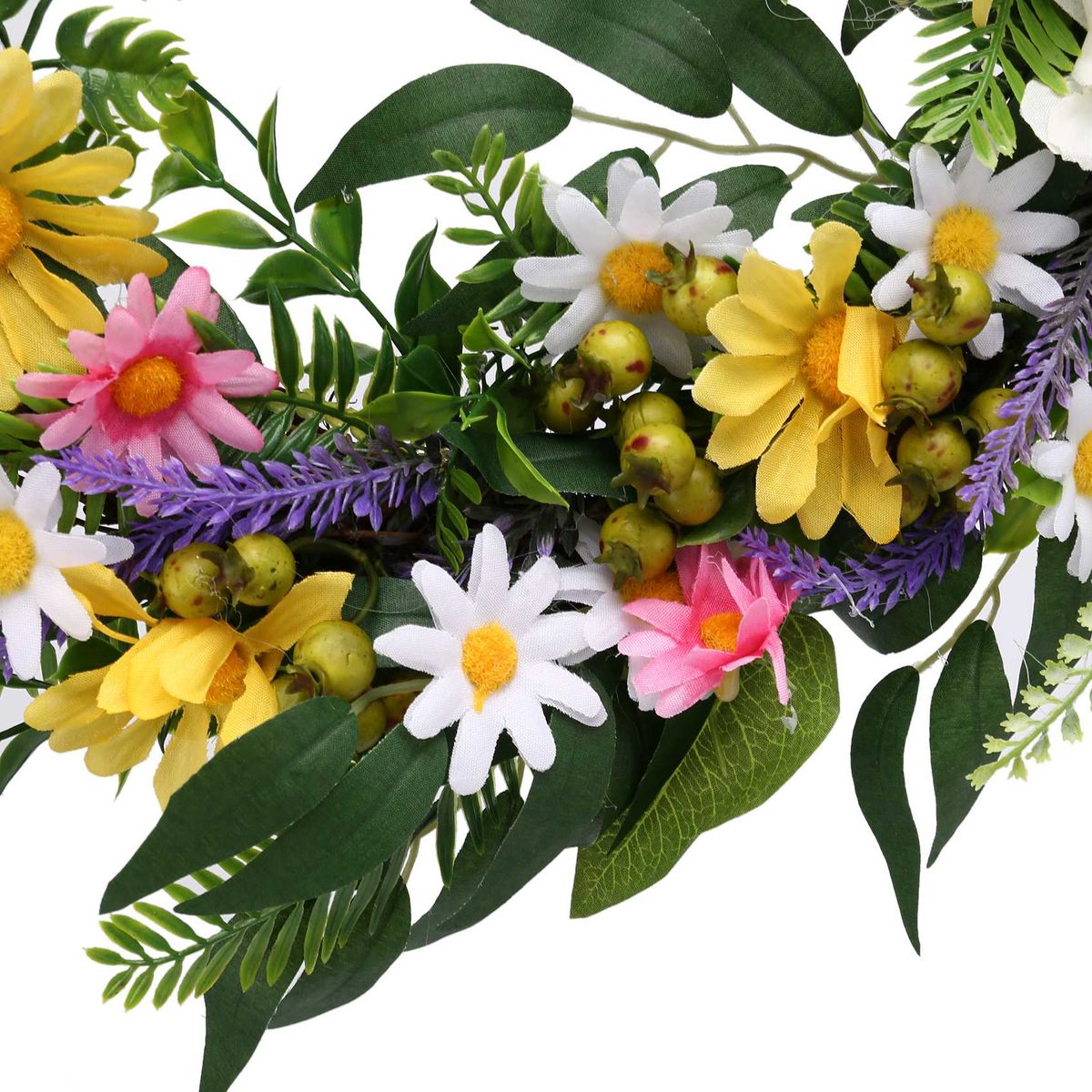 Detailed information about the product:[Full and lifelike]- This spring and summer artificial wreath is full of colorful flowers, such as daisies and lavender. There are also many green eucalyptus willow leaves and fern stems and clusters of white berries to make this wreath more realistic.