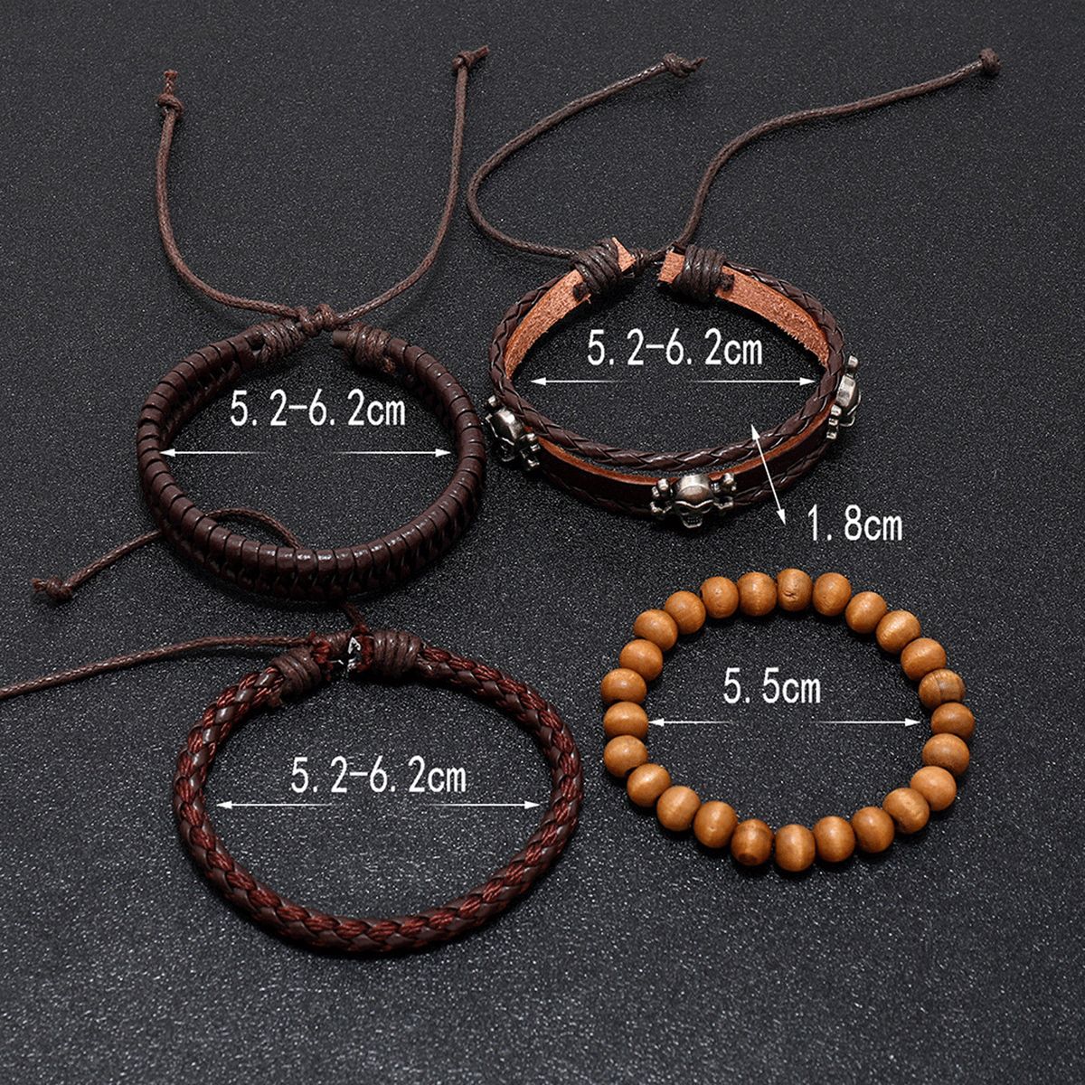 Name: PU leather braceletWeight: 26 gramsMaterial: PU+wax rope+alloy+wooden beadsStyle: retro European and Americanwooden bead braceletthree pirate princes