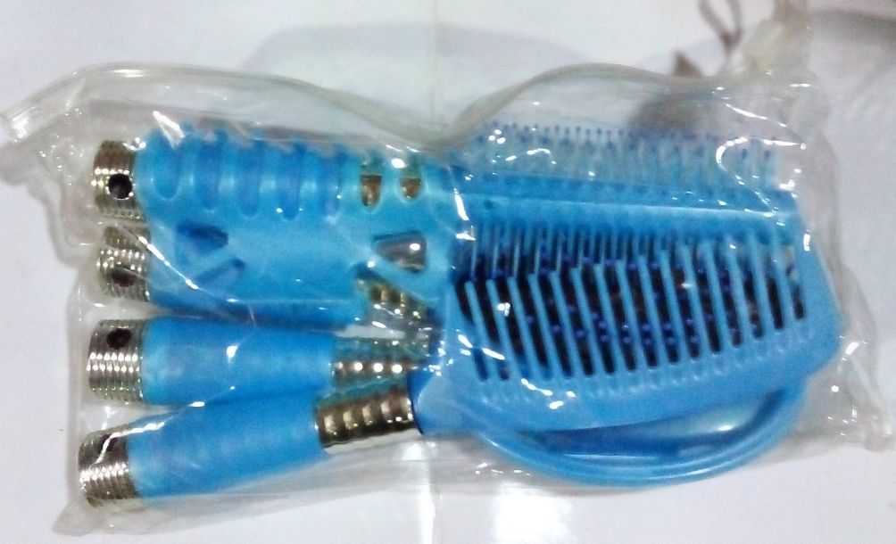This beautifully unique designed hair styling brush/comb with mirror and hair holder does a multiple purpose. Blue in colour. It has a CUSHION BRUSH - this is an oval shaped base with an air cushioned surface with it's compact design and comfortable grip. It has a soft rubber based and a stiff wire or plastic bristes. It is used for stimulating the scalp. It is also good for brushing out dandruff or build-up from hair styling. DETANGLING BRUSH -It is round or paddle brush with a handle for strong grip. It has a stiff wire for styling hair perfectly. FINE TOOTH COMB - the teeth of this comb is closely positioned together, allowing you to brush your hair with percision. It is used to straighten hair giving it a beautiful look. It is ideal for thick hairs. MIRRIOR - for reflection of oneself HAIR HOLDER- IT is designed to hold a styled hair.Long lasting. It is reusable and washable.