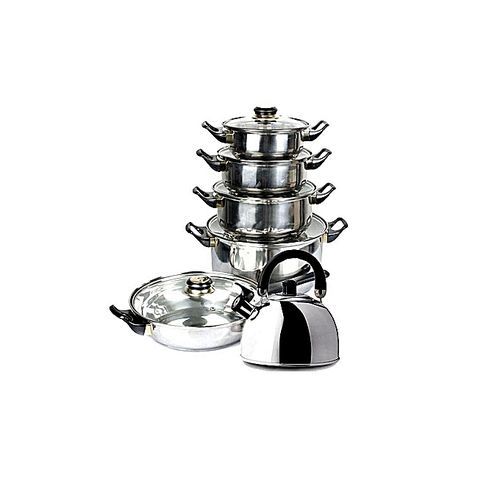 17pc S/s Cookware SetEvery detail of this high-quality 17pc cookware set reflects fine craftsmanship. Outstanding durability and cooking performance in heavy-gauge T304 stainless steel. The extra-thick impact-bonded bottom assures fast and even heating with no hot spots! The precision-formed rim and cover create a seal while you cook. A light flutter of the cover will tell you it is time to reduce the heat to low to allow the stored heat of the extra-thick bottom to finish cooking your food. Other high-quality features of this professional series cookware include: high-quality, heavy-duty stainless steel capped rivets on the heat-resistant phenolic handles, gleaming mirror finish exteriors, easy-to-clean satin polish interiors, and self-storing covers. Set includes: 3.2qt Saucepan with Cover; 2.5qt Saucepan with Cover; 1.7qt Saucepan with Cover; Large Skillet with Helper Handles and Cover; 7.5qt Roaster with Dome Cover; Egg Poaching Rack with 5 Egg Cups; and Steamer Insert. Limited lifetime warranty. White box.