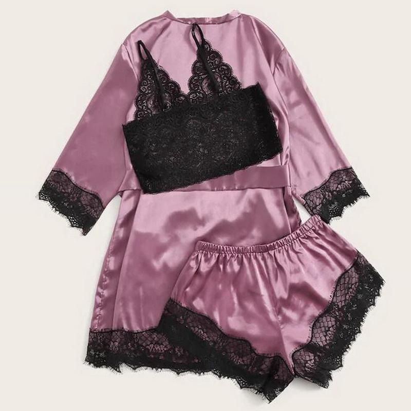 Conjunto de Pijama de encaje para Mujer ropa de dormir Sexy Bralette pantalones cortos bata de bano Pijama de saten 3 piezas