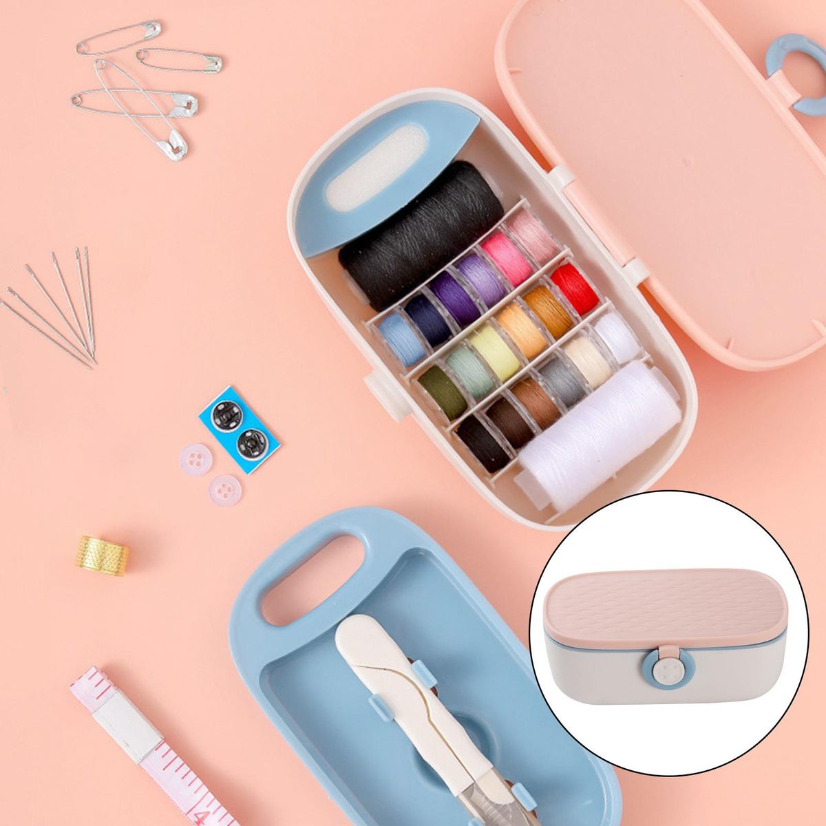 The kit contains the necessary tools that are required for sewing- 20 colors threads for sewing, 5pcs sewing needles, 1 , 1 measuring tape, 1 thimble, 4pcs round buttons, and 4pcs sewing pins.Double-layer design, Needles and in separate closed box for safety use.Available to meet daily sewing needs, such as sewing decorations, handicrafts, clothes, clothing production, etc.A delicate and compact sewing kit can be a gift for mother, kids, traveler to increase your happiness in life. It is lightweight and compact enough to easily fit into your suitcases, drawers, lockers or RV, convenient for you to use at any time.