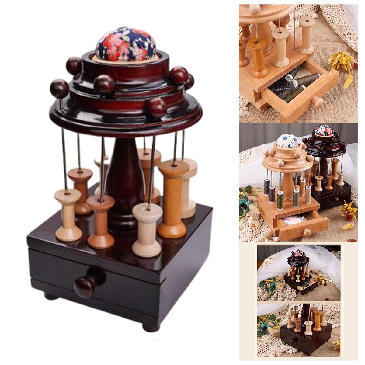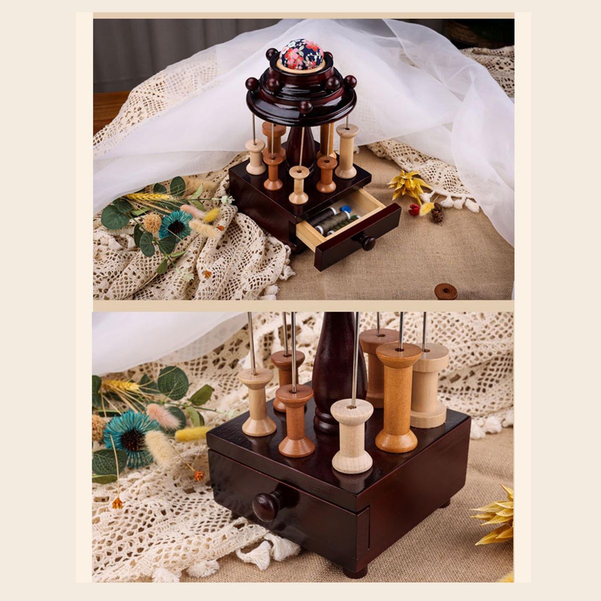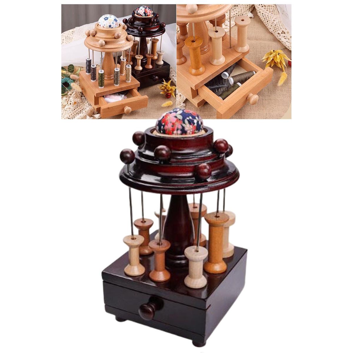 Handmade high quality wood material with spools and drawer, classic, solid, elegant and tasteful.