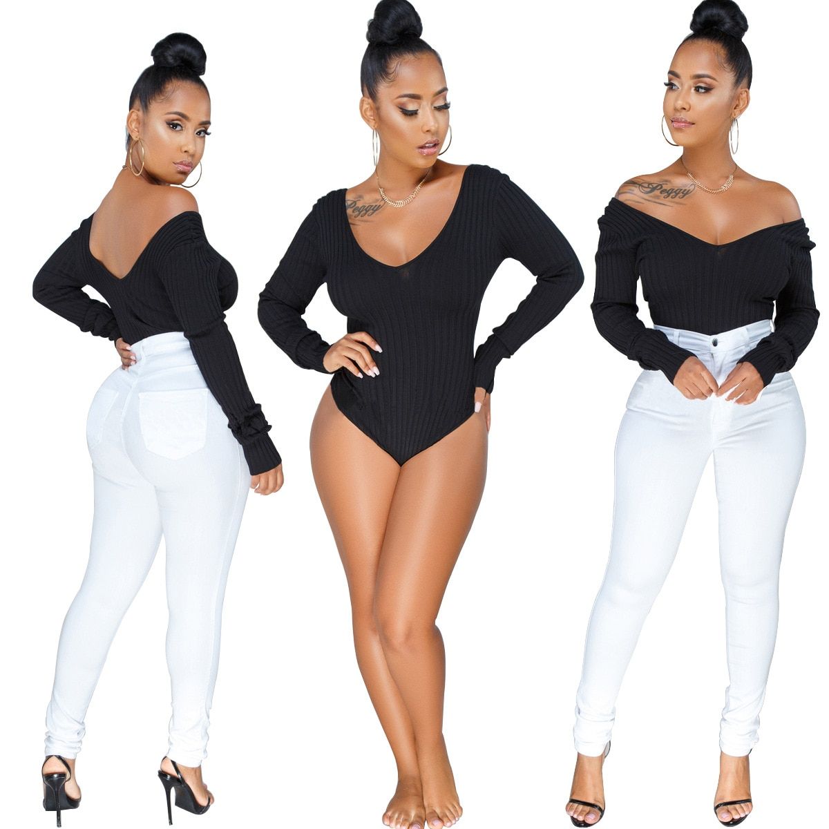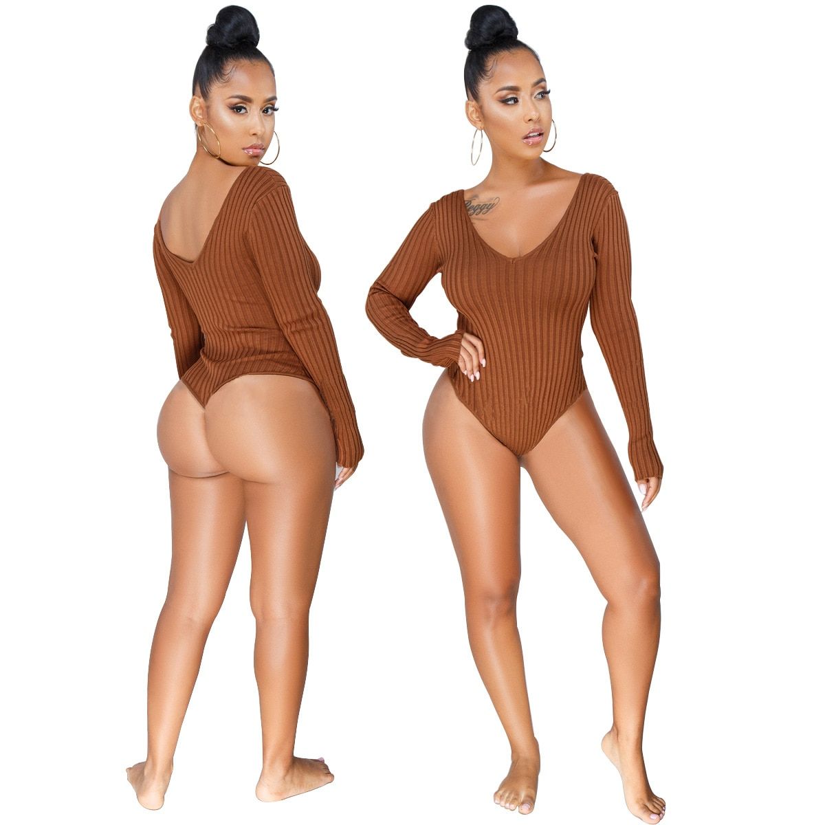 1X Sexy Bodysuits Women Rib Knitted V-Neck Long Sleeve Beach Playsuits Bandage Jumpsuits Ladies Rompers PlSize