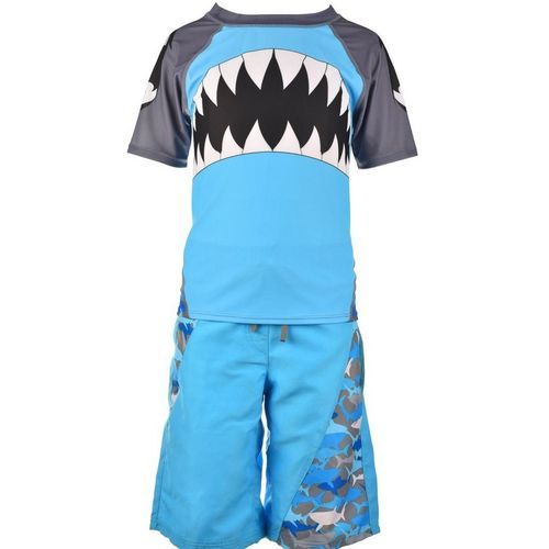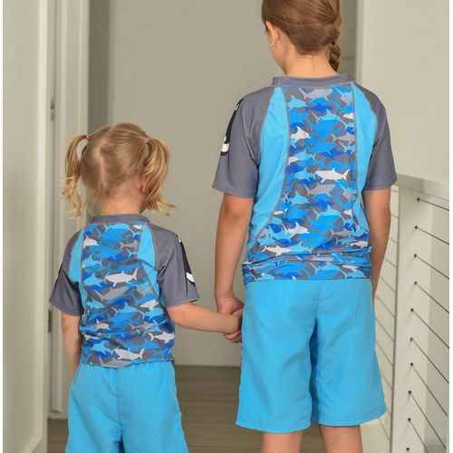 If you love chasing mermaids in the water, we've got just the thing for you! Our Shark Swimsuit Set features multiple colors of blue, white, gray, and black in a playful design exclusive to Fin Fun. The rash guard features a mischievous shark face design, with shark teeth spanning across the chest and glaring eyes adorning the sleeves. A contemporary “shark ca mo” pattern runs the length of the backside, confined within a solid-colored bright blue and gray design. The ca mo pattern carries to the blue board shorts in a shark-fin shape found on the legs of the shorts. An elastic drawstring waist ensures the perfect fit. This set is ultra-comfortable to swim in and stylish too! Grab your shark fin and get ready to swim!