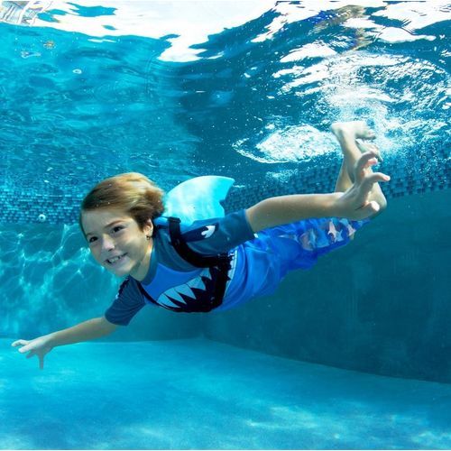 If you love chasing mermaids in the water, we've got just the thing for you! Our Shark Swimsuit Set features multiple colors of blue, white, gray, and black in a playful design exclusive to Fin Fun. The rash guard features a mischievous shark face design, with shark teeth spanning across the chest and glaring eyes adorning the sleeves. A contemporary “shark ca- mo” pattern runs the length of the backside, confined within a solid-colored bright blue and gray design. The ca mo pattern carries to the blue board shorts in a shark-fin shape found on the legs of the shorts. An elastic drawstring waist ensures the perfect fit. This set is ultra-comfortable to swim in and stylish too! Grab your shark fin and get ready to swim!