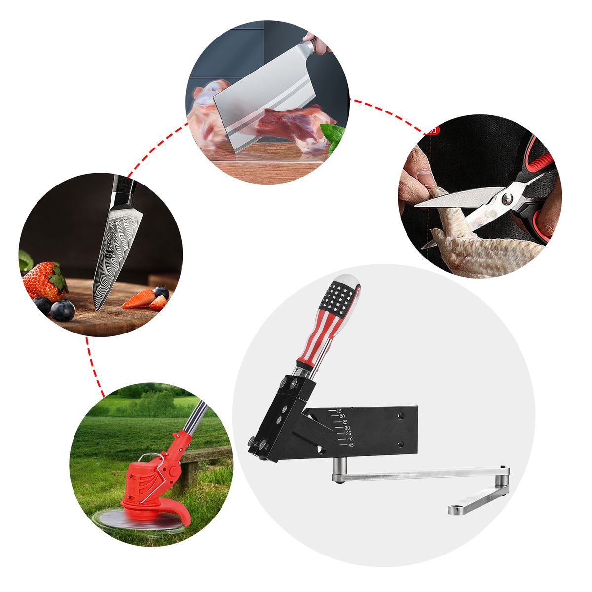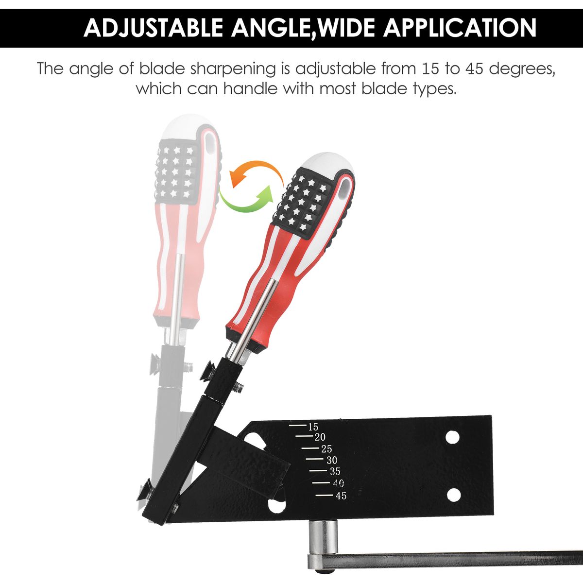 The angle of blade sharpening is adjustable from 15 to 45 degrees, which can handle with most blade types.