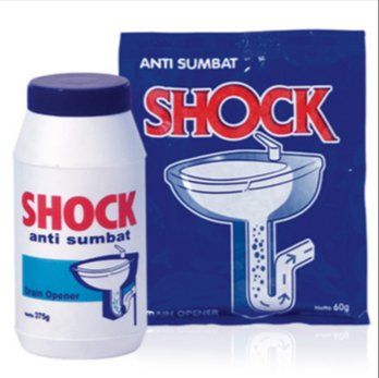 Shock anti sumbat drain openerSHOCK Powder Anti-Clogging for Sink ,Toilet, Bidet Pipe ,Septic Tank 375g Anti-Clogging/Anti-Clogging Powder ,for opening of drain ,it can destroy any type of blockage in your home's and office's.Rules for use: Prevent clogged ducts: 1. Pour 2-3 tablespoons of SHOCK! into the sewer. Fill the funnel with 1/2 cup of water (100-150ml). Let stand 10-15 minutes, then flow the heavy water into the drains. 2. Do it every week, so that the drains run smoothly and avoid blockages.
