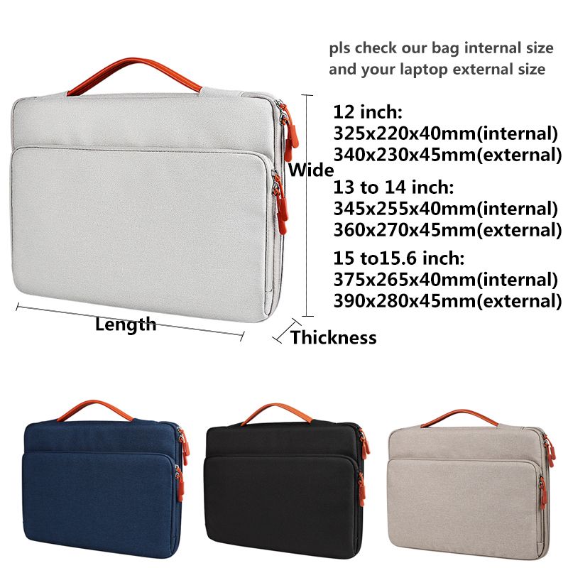 pls check our bag internal size and your laptop external size12 inch:325x220x40mm(internal)340x230x45mm(external)13 to 14 inch:345x255x40mm(internal)360x270x45mm(external)15 to15.6 inch:375x265x40mm(internal)390x280x45mm(external)Shockproof Laptop Carring Case Bag 13.3 15.6 inch for MacBook Air 13 M2 Chip Apple Mac Book Pro 14 16 2023 Huawei Dell Acer Asus
