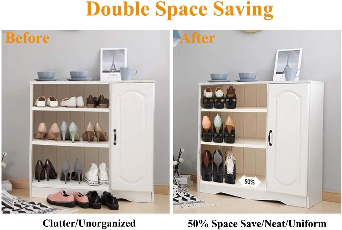Our space-optimizing shoe organizer will help you double your shoe storage space in a snap!