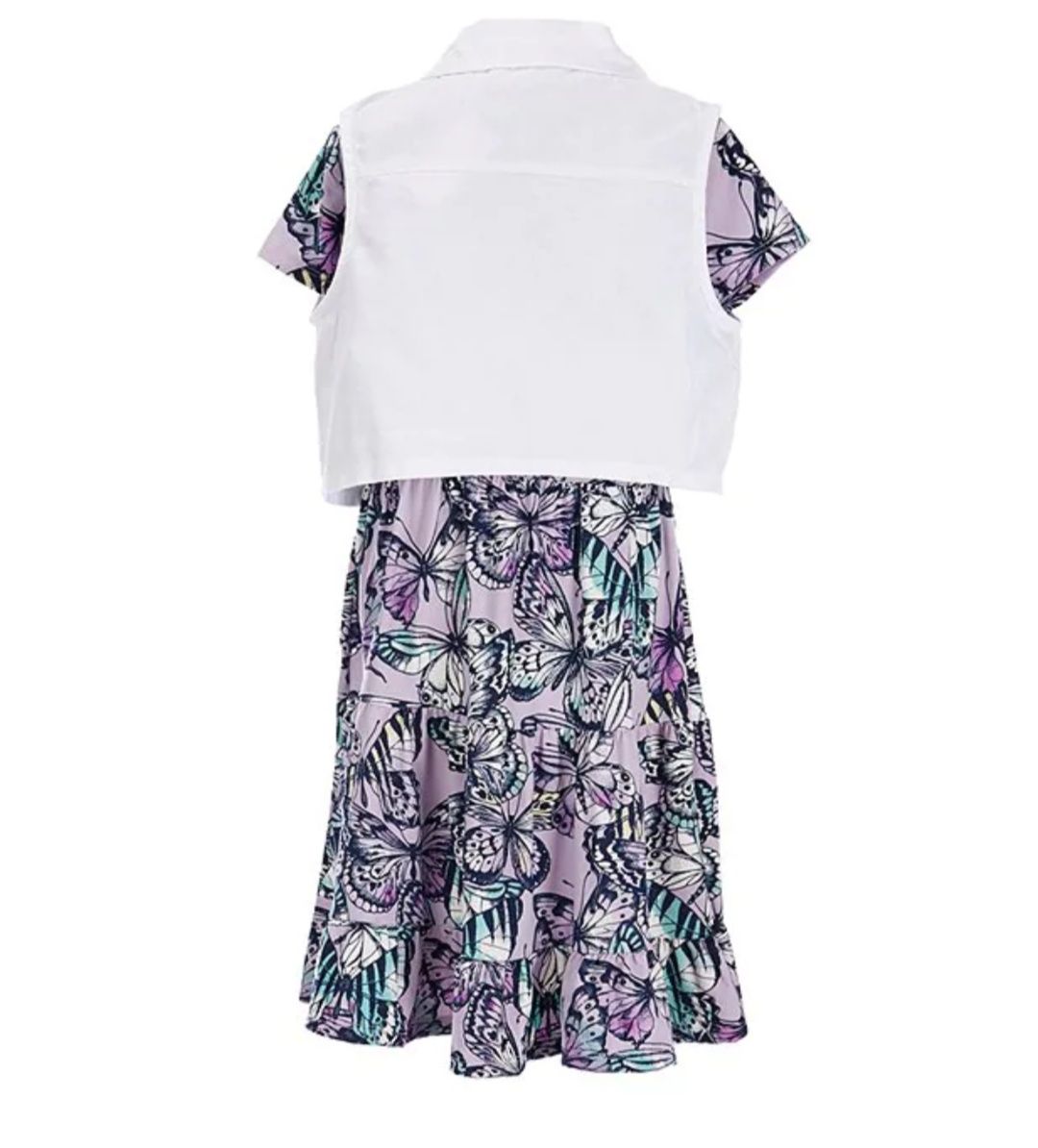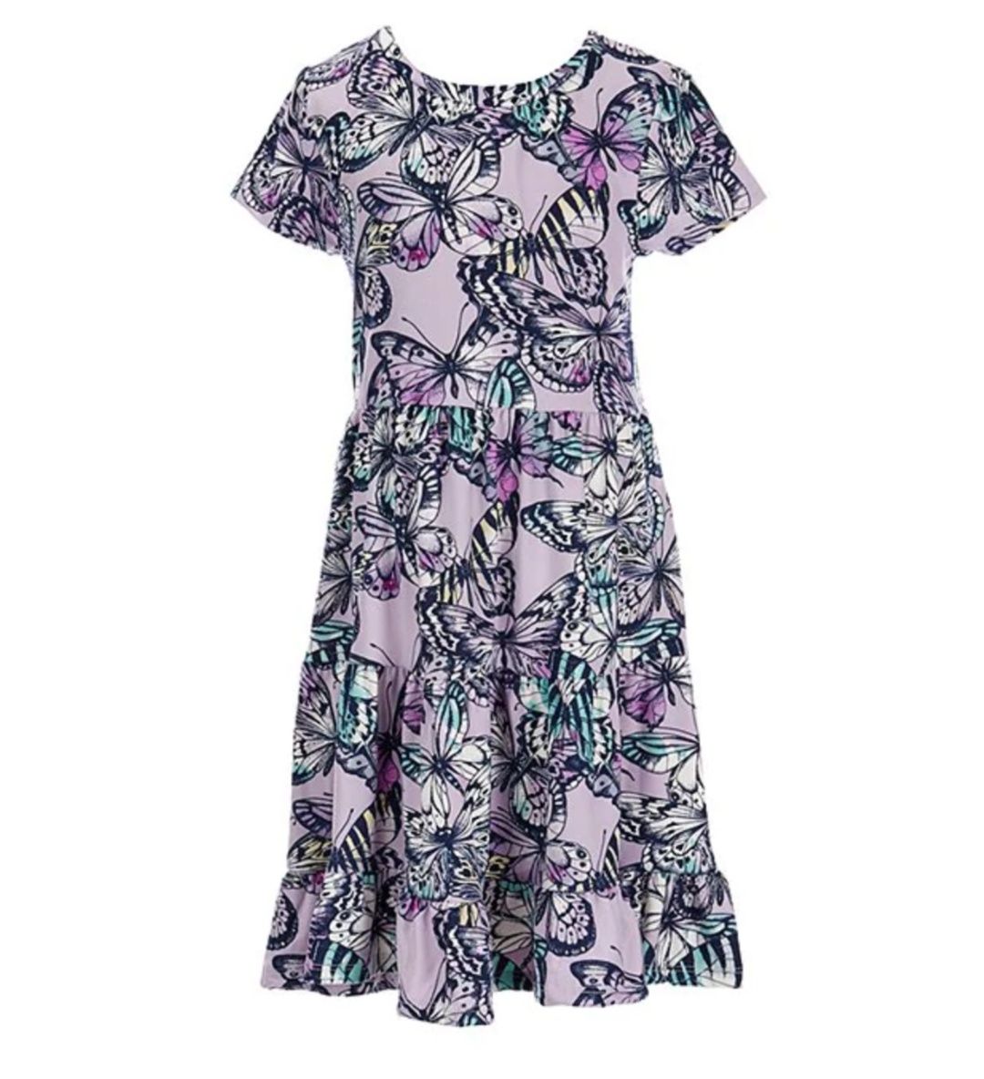 - All over butterfly printed dress with round neckline, short sleeve, tiered skirt and pullover styling