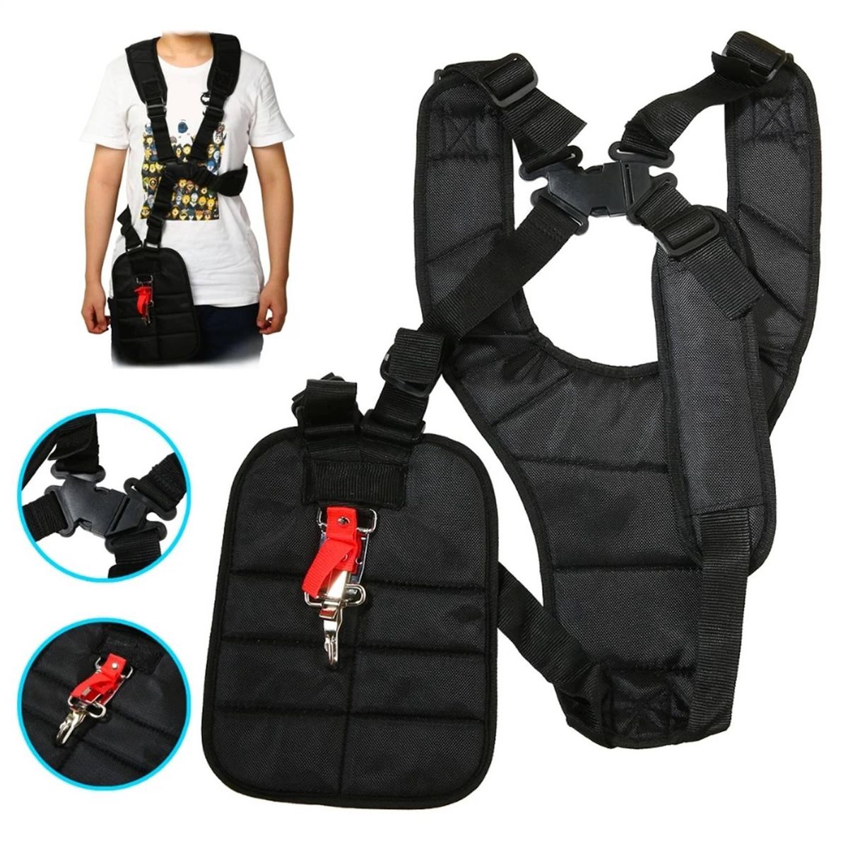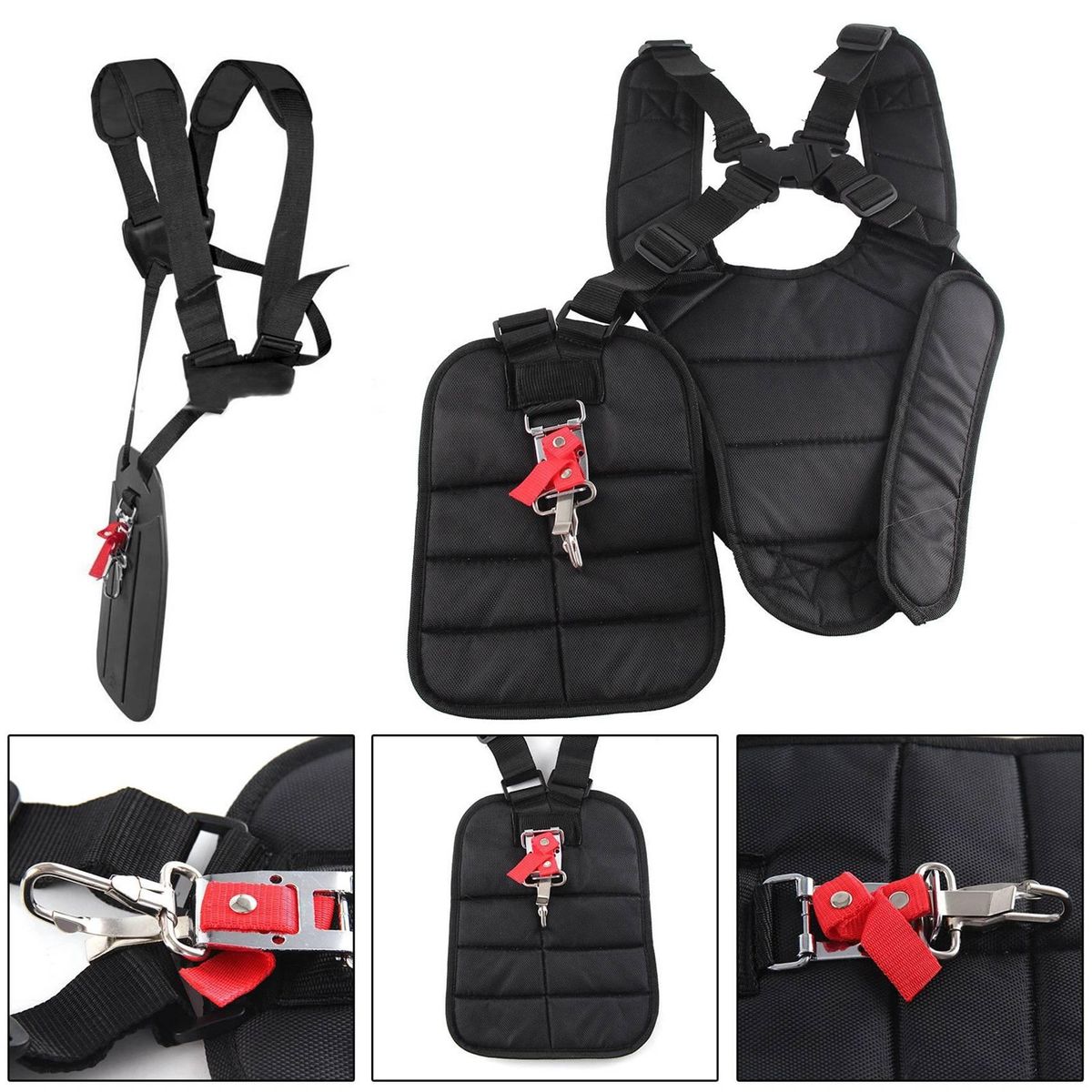 Description: This item isdesigned to fit nearly all makes of electric and petrol trimmers, however big or heavy they are.Once the strap has been attached to the trimmer it remains firmly in place, until you decide to release it. Safety and comfort are the key to the grass trimmer shoulder strap.The strap wont dig into your shoulder, because it has an impact softening shoulder pad.This is a universal double shoulder harness to suit many makes and models trimmers, strimmers and brush cutters.