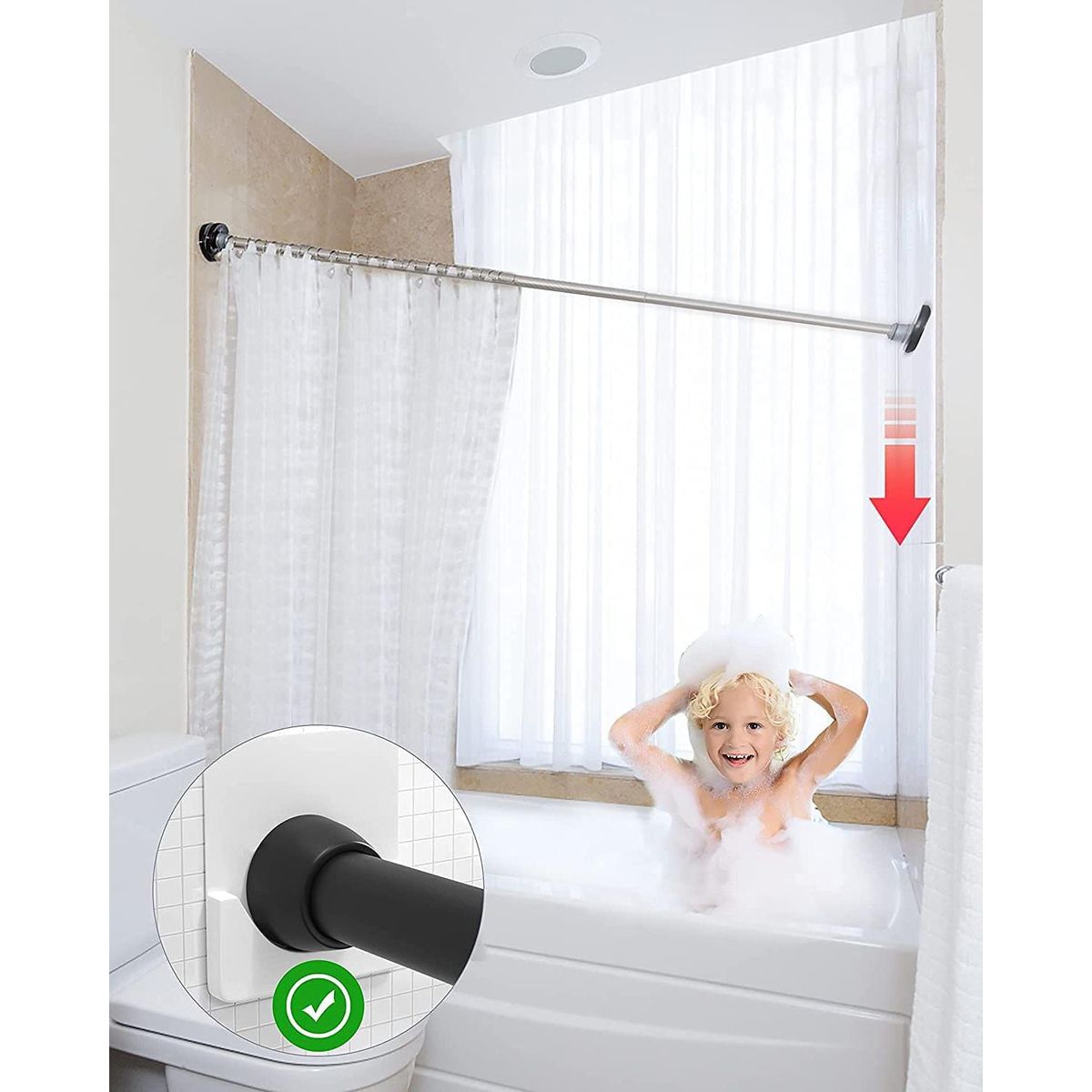 - 1, Protect Your Family:This shower curtain rod holder prevents falling curtain rods from hurting people or damaging bathtub tiles,thus making your bathroom safer.Ensure the safety of family members when taking a bath,and will not damage the wall paint.