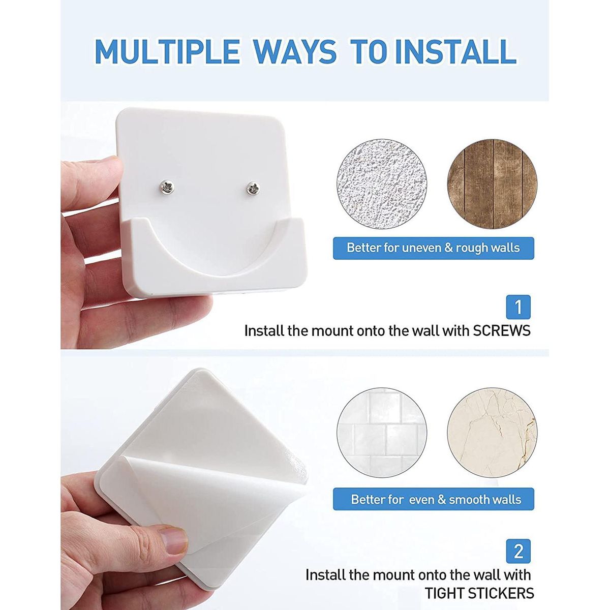 3, Multiple Installations:Suitable for all kinds of bathroom walls.If the wall is not flat or level,please use screws to install the mount on the wall;otherwise,please reinstall it.If the wall is flat and smooth,just peel it off and paste it,the installed pole frame will not drill or damage the bathroom tile or wall.