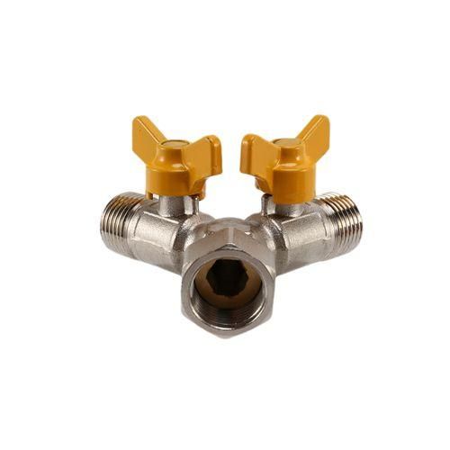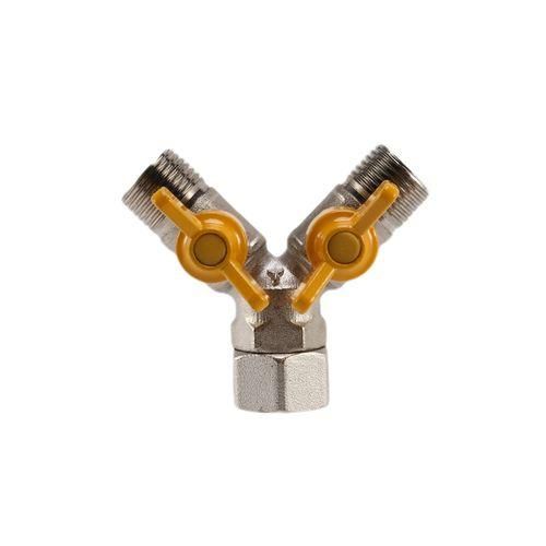 It has a 1/2-inch IPS female thread inlet on one end and two 1/2-inch IPS male connection on the other ends.