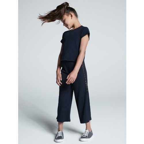 Trade in traditional dresses for this trendy glitter co-ord. Flaunting a short sleeve t-shirt with a crew neckline and a luxe ribbed feel, this party outfit is finished with wide leg elasticated trousers and a lurex rainbow side stripe, creating a twirl-worthy twinkling Christmas look!