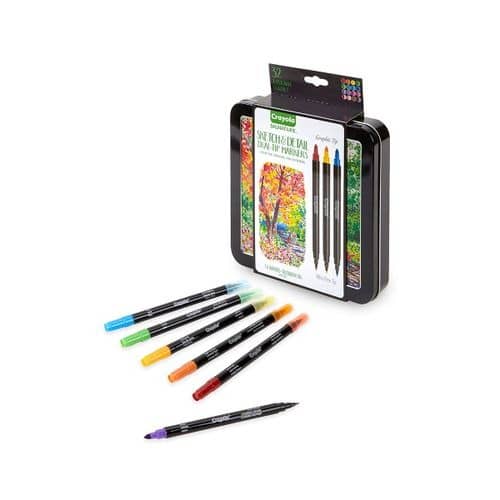 Crayola Sketch & Detail Markers provide creative versatility in coloring and art projects. Sketch, draw, hand letter, do faux calligraphy, and blend colors for great outcomes. Twice the colors, create double the coloring fun & mdash;16 Dual Ended Markers for a total of 32 complementary colors! This Dual Tip Marker Set allows for quick switching from bold strokes to ultra fine lines for intricate details. Comes in a beautiful artist rendered Storage Tin, making it a great gift for adult coloring enthusiasts and more.