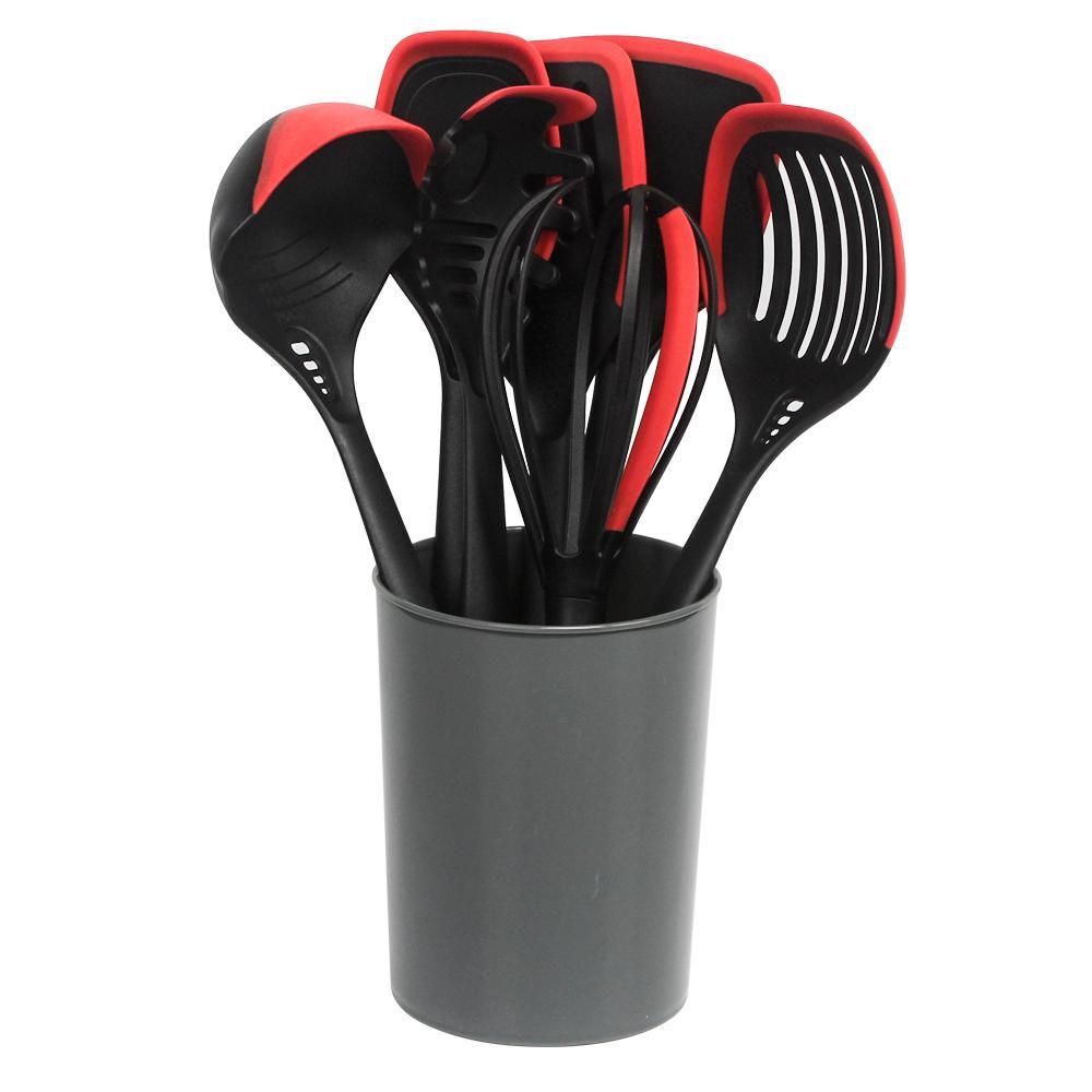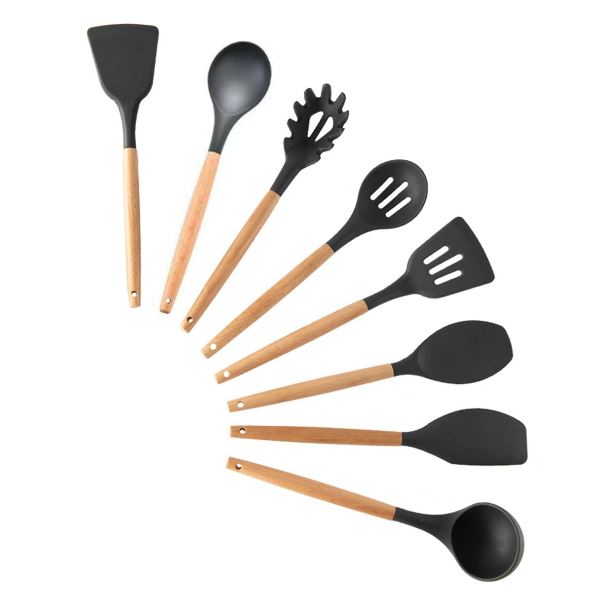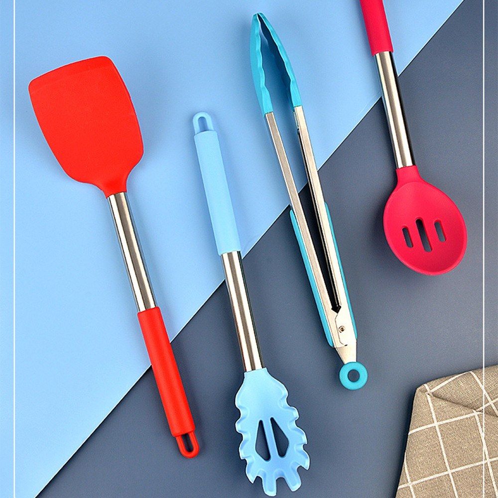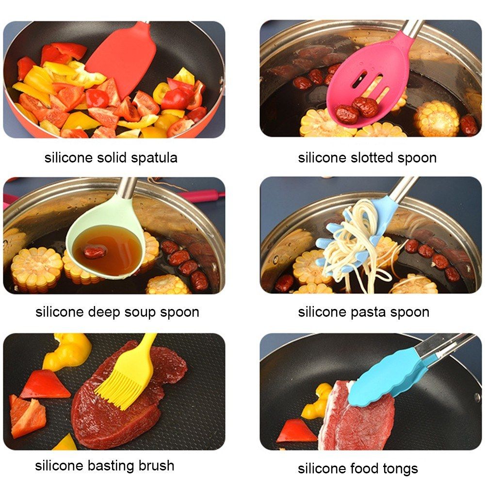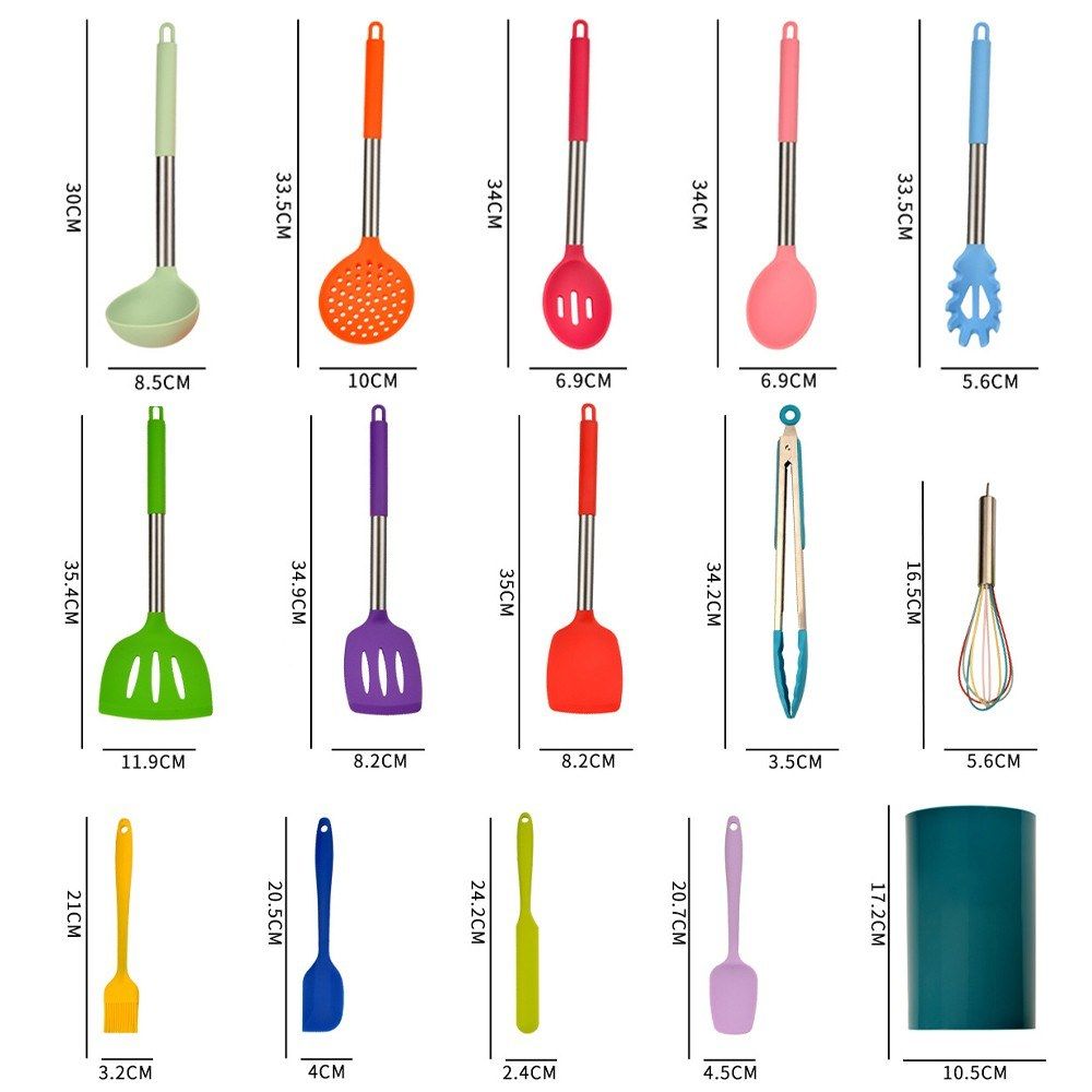 14 Sets of Kitchen Utensils: 14 sets of professional silicone kitchen utensils, including deep soup spoon, slotted spoon, solid spoon, pasta spoon, slotted spatula, solid spatula, food tongs, egg whisk, basting brush, flexible spatula, etc. to meet your various kitchen needs.