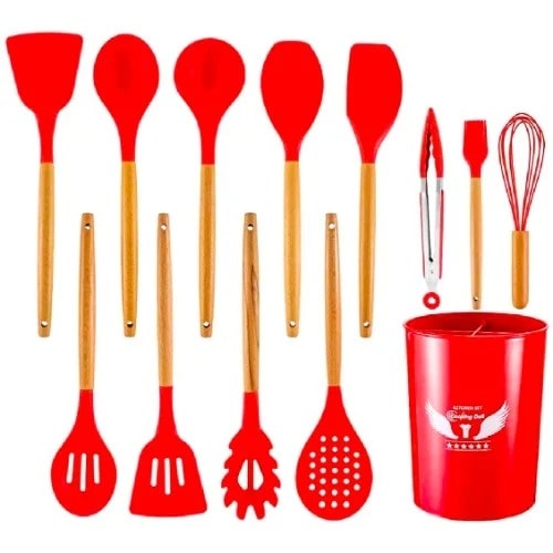 Buy Silicone Cooking Utensils Set Non-stick With Wooden Handle & Holder - 12pcs - Red in Nigeria