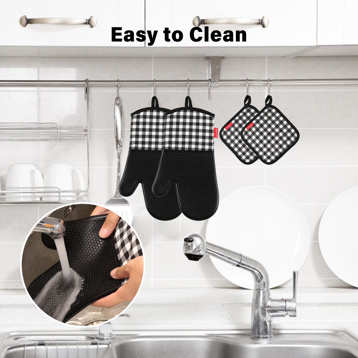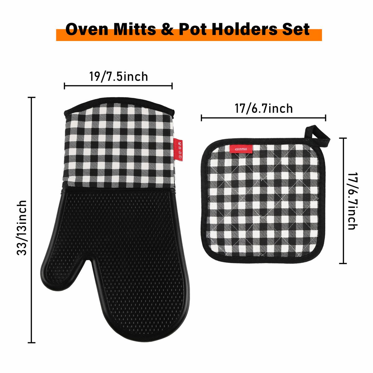 Set includes a pair of oven gloves and two pot pads. The extra long glove are made of silicone and cotton, providing superior heat resistance to protect your hands. The pot pads with quilted cotton lining and covered edges can protect your table from scratches and stains.