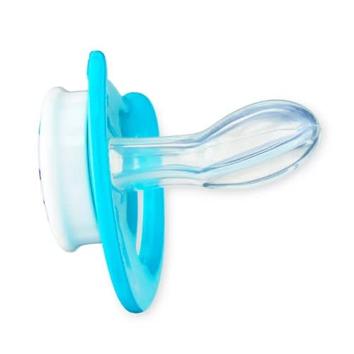 Comfort your baby with these Pacifiers. These silicone pacifiers feature a soft orthodontic nipple that works to soothe and calm your sweet little one. Each pacifier is made with BPA-free materials, making them a safe product for your baby to enjoy, and their slightly curved shield design with ventilation holes prevents skin irritation. With two pacifiers in every pack for children six months and older, you'll be able to keep your baby's mood bright and content. When you're ready to disinfect your baby's pacifiers, just toss them onto the top shelf of your dishwasher to make cleaning a breeze. Complete your baby's nursery with a pack of these Pacifiers.