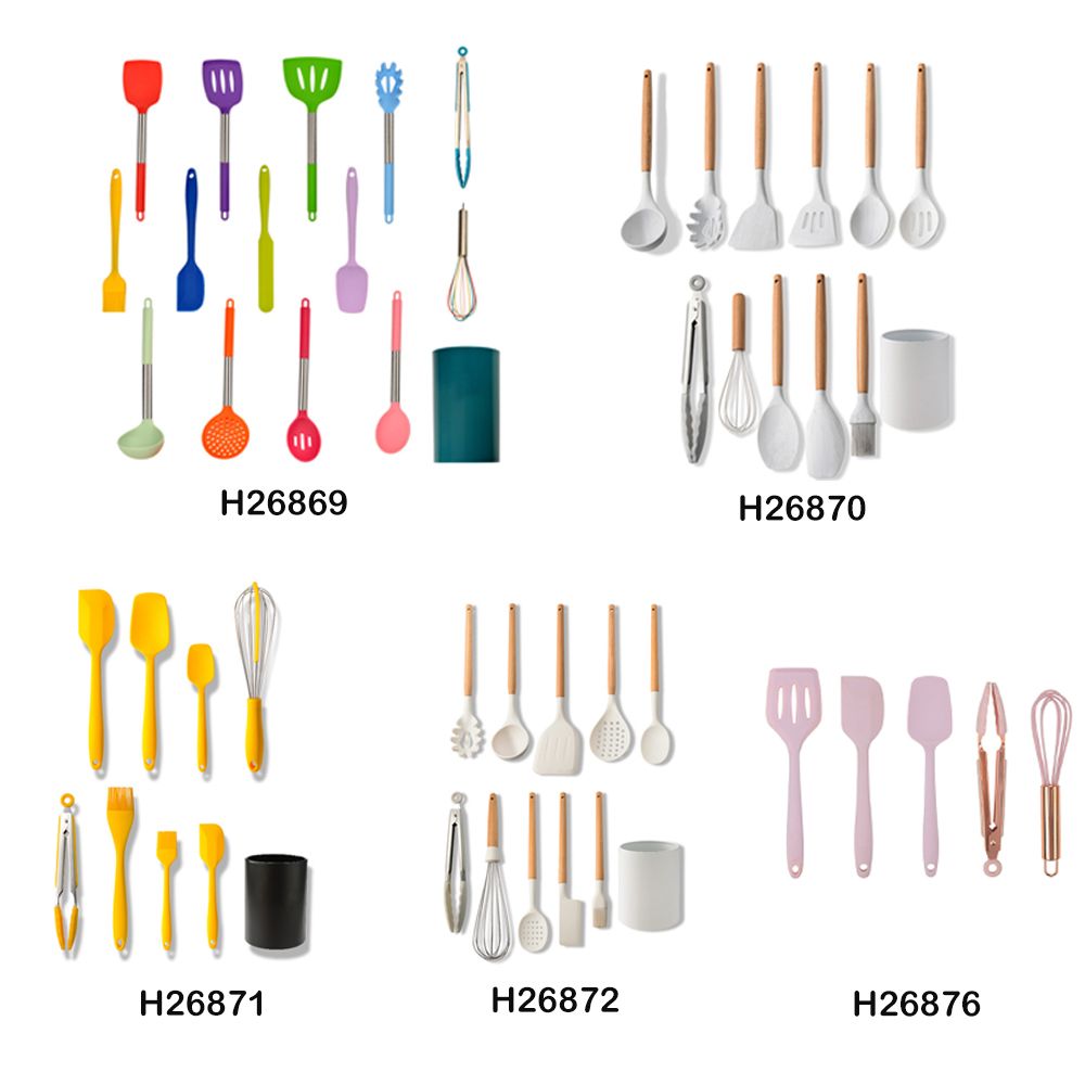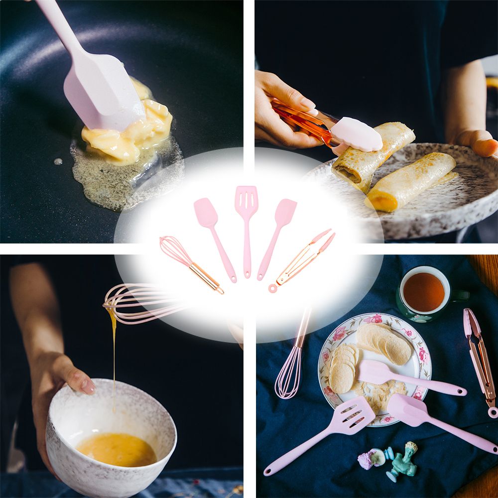 The silicone spatula sets include 1* slotted spatula, 1* flexible spatula, 1* spoon spatula, 1* egg whisk, 1* food tongs. Variety to meet all your needs.