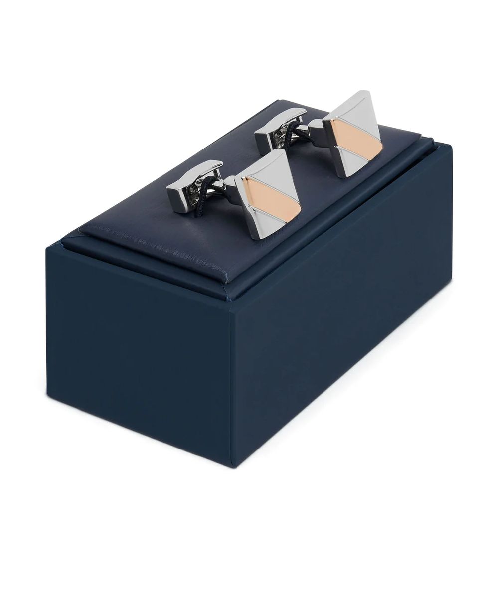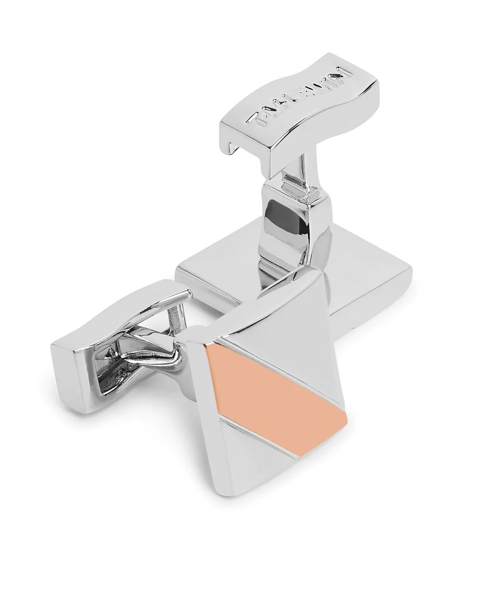 This pair of square cufflinks combines two complementary colours - silver and rose gold - to create a two-tone effect. The front is silver-coloured with a contrasting colour-blocked rose gold design. The polished finish catches the light, bringing a subtle gleam to your formal attire.