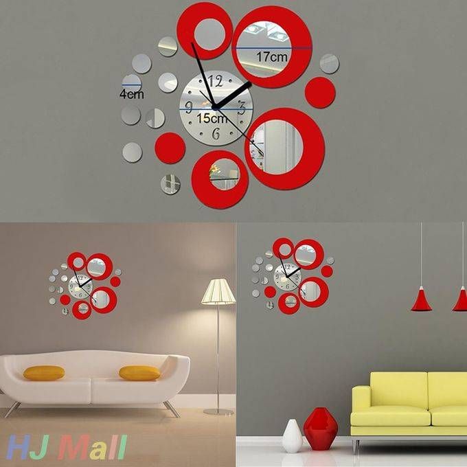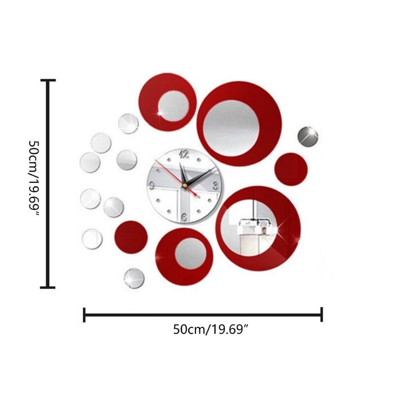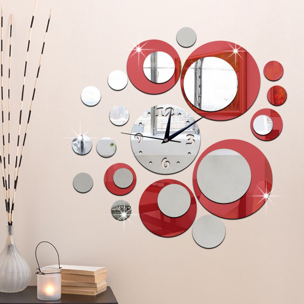 1pc x Silver Red Circle 3D Crystal Mirror Wall Clock Acrylic Mirror Wall Sticker Clock Home Decor