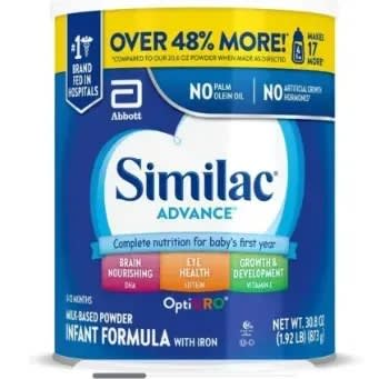 Similac Advance* is a nutritionally complete, milk-based, iron-fortified infant formula for baby’s first year. It has our exclusive blend of ingredients to support baby’s brain and eye development. Our no palm olein oil blend supports excellent calcium absorption. Similac was the first leading infant formula brand with no artificial growth hormones† and is the #1 infant formula brand fed in hospitals. * Not for infants or children with galactosemia. † No significant difference has been shown between milk derived from rbST-treated and non-rbST-treated cows