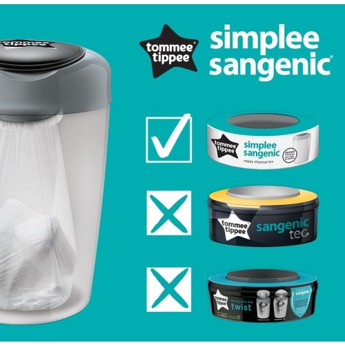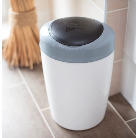 The only bin that twists and wraps for guaranteed odour protection. The Twist & Click nappy disposal bin provides guaranteed odour and germ protection to keep your home fresh and smell-free. This great value bundle includes one Twist & Click nappy bin with one pre-loaded refill cassette plus an additional pack of 6 refills.To reduce the impact on the environment The Twist & Click nappy bin and refill cassettes are made from 98% recycled and fully recyclable plastic. Our multi-layer antibacterial film is now bio-based and made from sustainably sourced sugar cane GREENFILM & trade;.The Twist & Click nappy bin is the only nappy bin to twist and individually wrap each nappy, safely sealing away odours and germs, keeping your home tidy and odour free. The multi-layer, anti-bacterial GREENFILM & trade; is 100x more effective than nappy sacks as it is Biomaster** protected to kill 99% of dangerous germs like E-coli and Staphylococcus Aureus. On contact it stops proteins being broken down by bacteria, a process responsible for lots of nasty smells. The smart sealing lid encloses all unpleasant odours and the inbuilt plunger pushes nappies deep into the bin, keeping your hands clean.Despite its compact size, the Twist & Click nappy bin can hold up to 28 nappies* at once, meaning fewer trips to the outside bin. The flat lid opens against any wall, making it easy to position and use. This great value bundle includes one Twist & Click nappy bin with one pre-loaded refill cassette plus an additional pack of 6 refills. Each refill provides enough anti-bacterial film to wrap up to 1 months & rsquo; worth* of nappies depending on the size and number you use. For optimum performance and guaranteed protection against odours and germs, we recommend using Twist & Click branded refill cassettes in your Twist & Click nappy bin. Please note that the Twist & Click nappy disposal system is only compatible with the Tommee Tippee Twist & Click refills. Sangenic TEC & Simplee Sangenic refill cassettes are not compatible with this bin.