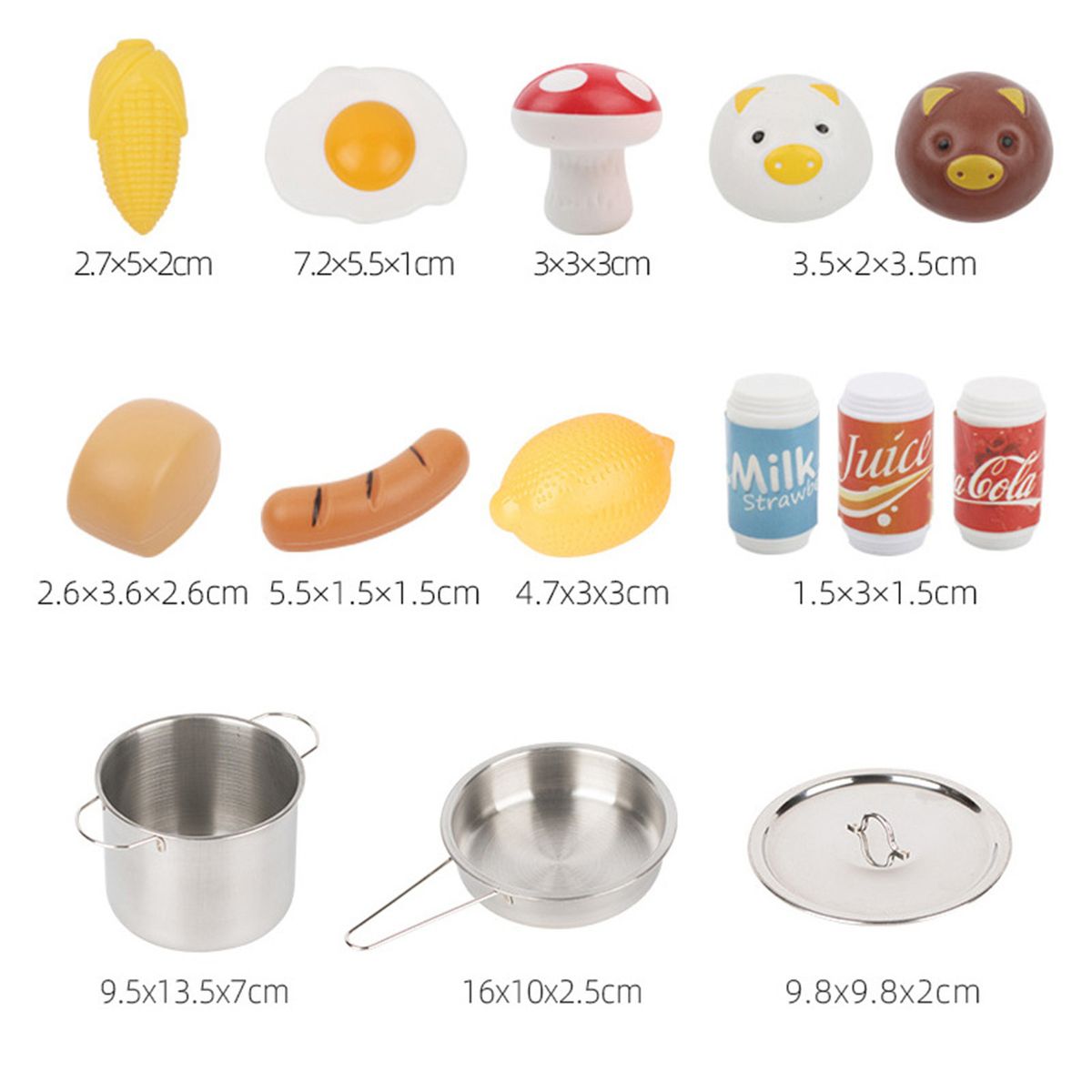 2. High-quality materials: All fake toy sets are made of safe and thick materials. The pan and pot are made of 100% stainless steel, which is very durable and wear-resisting. The forks and spoons with hand-polished handles will not hurt children. Colorful and healthy vegetable toys are easy to clean and durable. Let the children have the opportunity to have a long hours of fun.