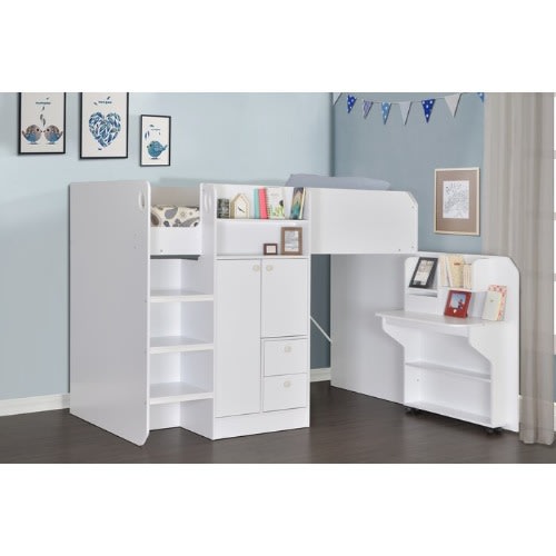 Great quality high sleeper with a robust, sleek look, it includes a fold-out desk, wardrobe, drawers and 2 shelves for maximum storage space.