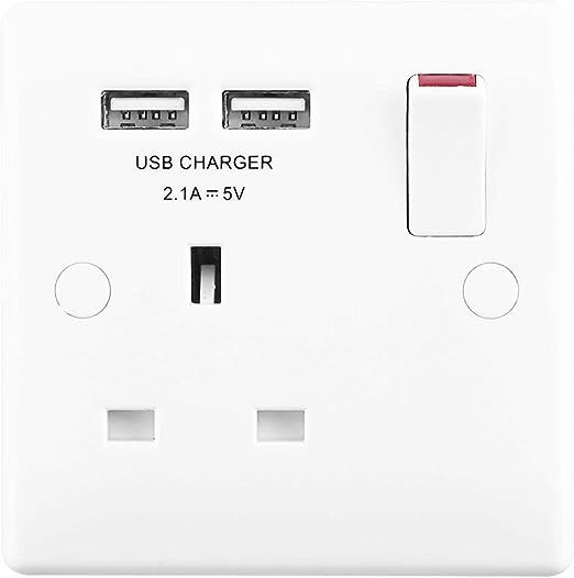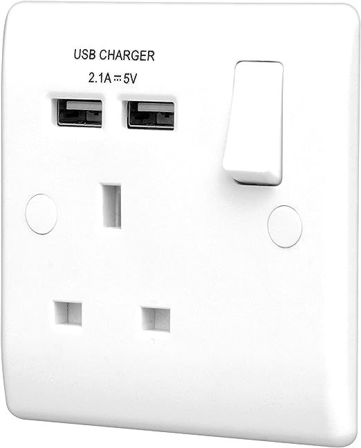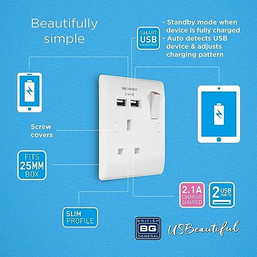This Nexus 800 series white moulded 13A single socket from British General comes with two USB charging ports allowing you to plug in an electrical device and charge mobile devices simultaneously without having to sacrifice a power socket. Its moulded white front-plate has a high resistance to fading, discolouration and scratches, with inherent anti-microbial properties proven to reduce bacterial development and inhibit the growth of infectious diseases. With its rounded edge finish, the white moulded wall plate will seamlessly fit with any style or decor in your home, and fits a 25mm backbox, ideal for retro-fit.