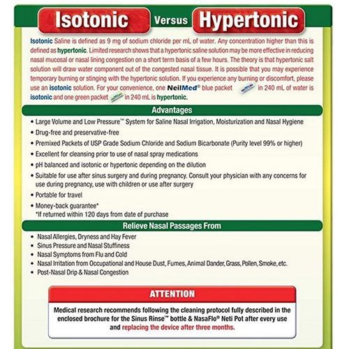 - Use withSinus Rinse or NeilMed Neti Pot or NeilMed Sinugator Isotonic Versus HypertonicIsotonic Saline is defined as 9 mg of sodium chloride per mL of water