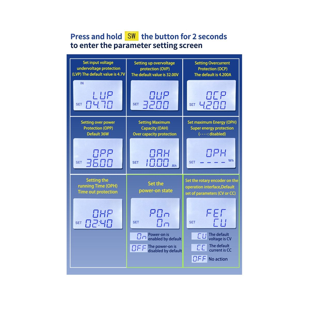 Set the maximum discharge time OHP When the OHP function is activated when the power supply running time is the maximum discharge time set the power supply will automatically turn off the output and flash "OHP" after the OHP alarm is released the time statistics data will be cleared automatically Function can realize quantitativetiming power supply