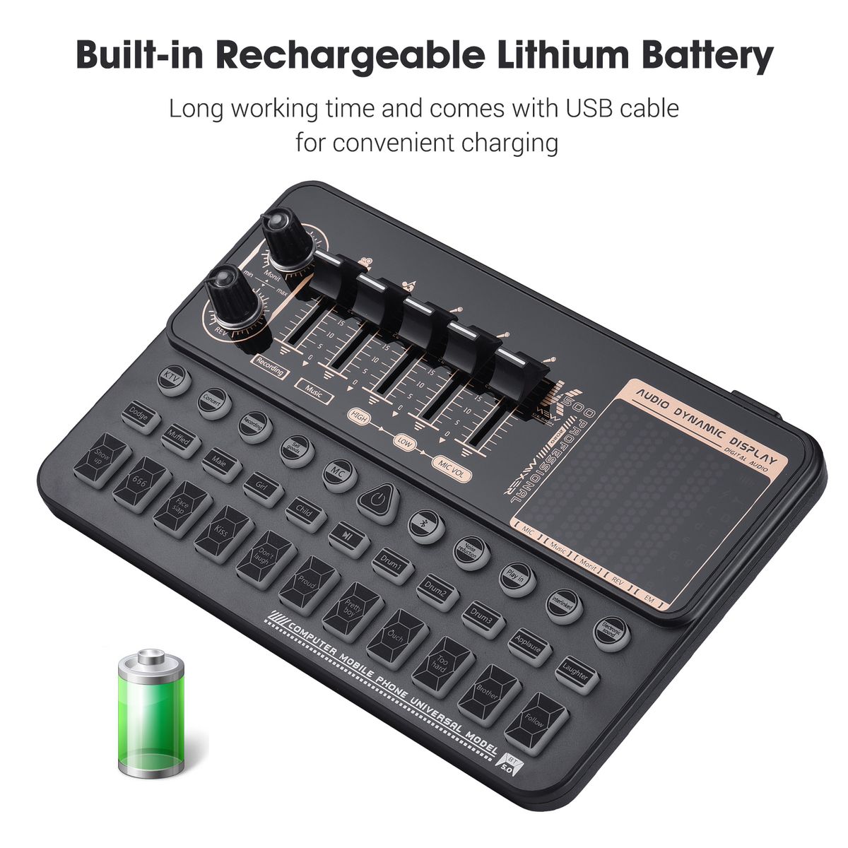 Portable and Eye-catching: Built-in rechargeable lithium battery and compact size design, you can carry the sound card around and use it anytime anywhere; and the colorful button light effects make it look super cool at night.