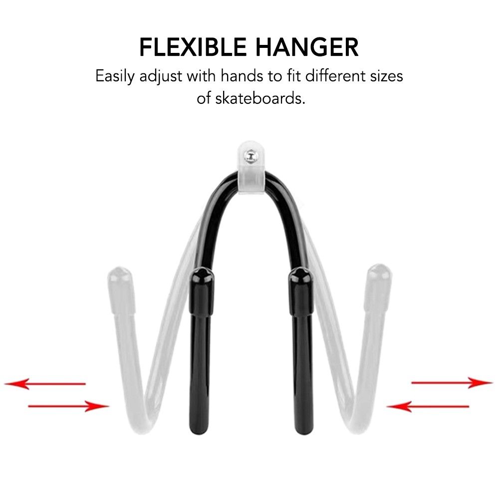 Flexible hanger to easily adjust with hands to fit different sizes of skateboards.