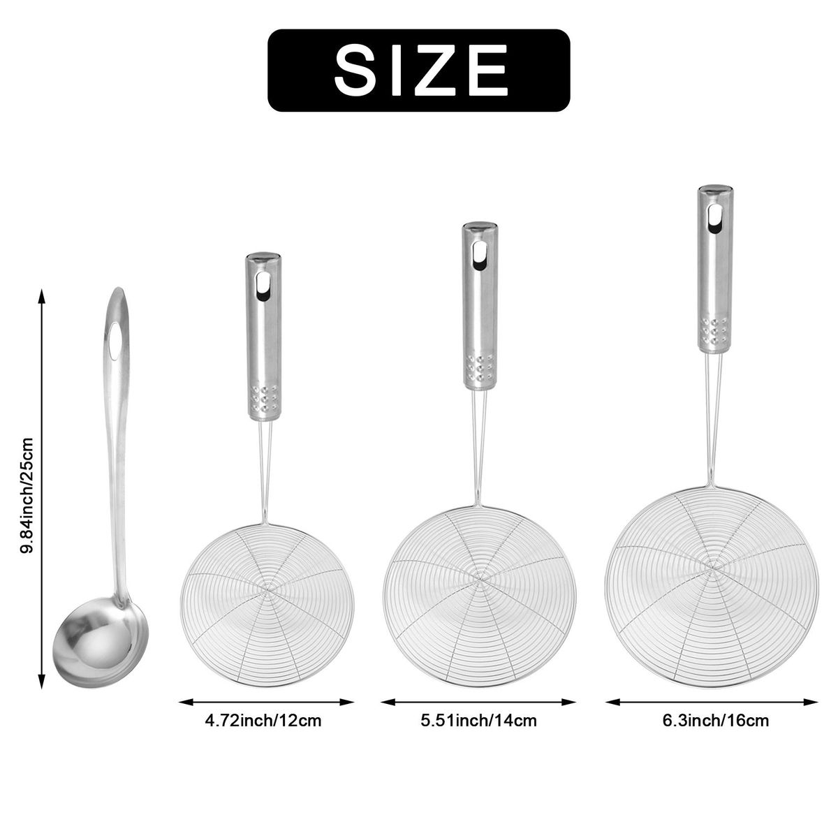 Detailed Information About The Product:SKIMMER SPOON: 4 pack spider strainer donut spoon is solid and durable, sturdy outer framework. The skimmer set won't react with foods, and offer you the best durability and using experience.