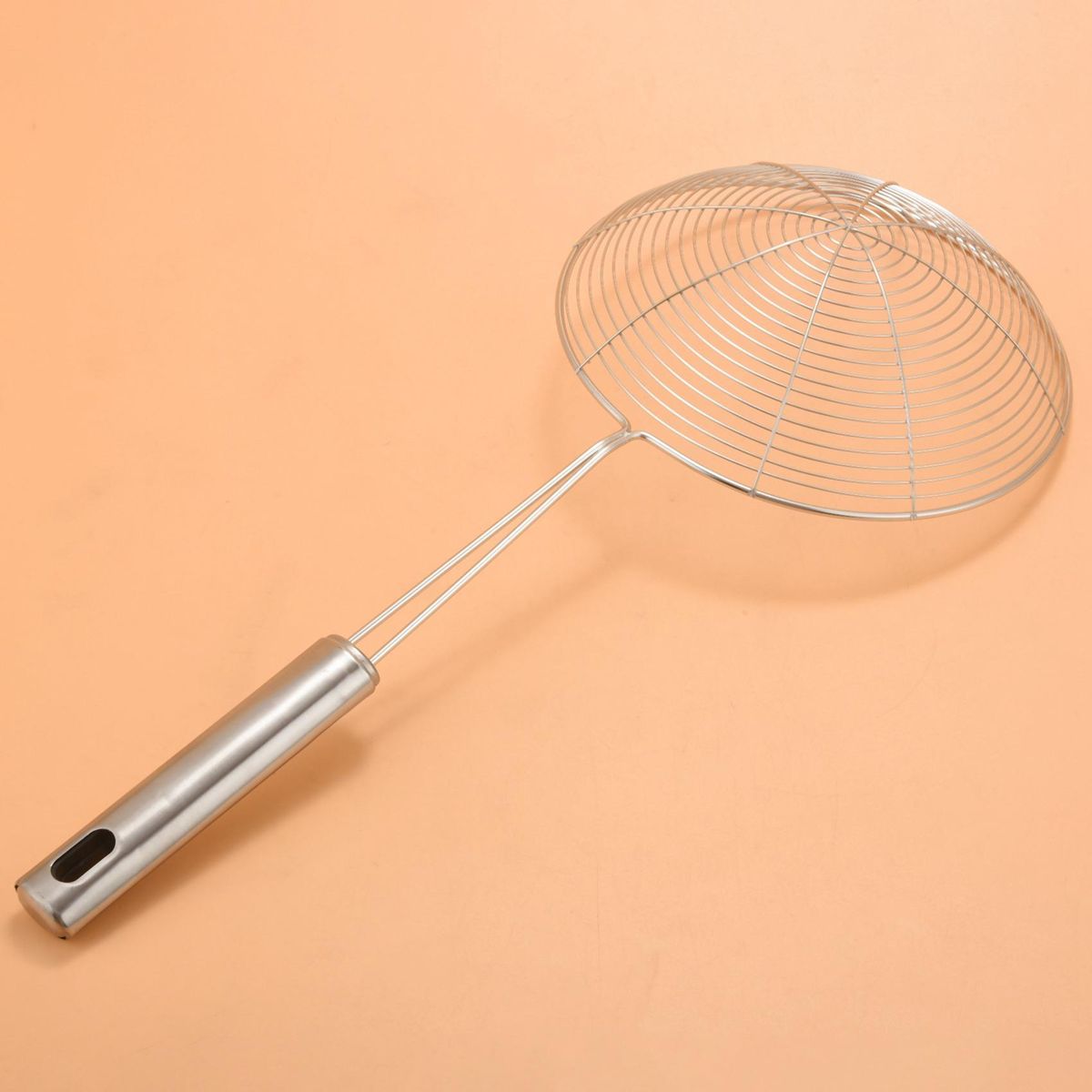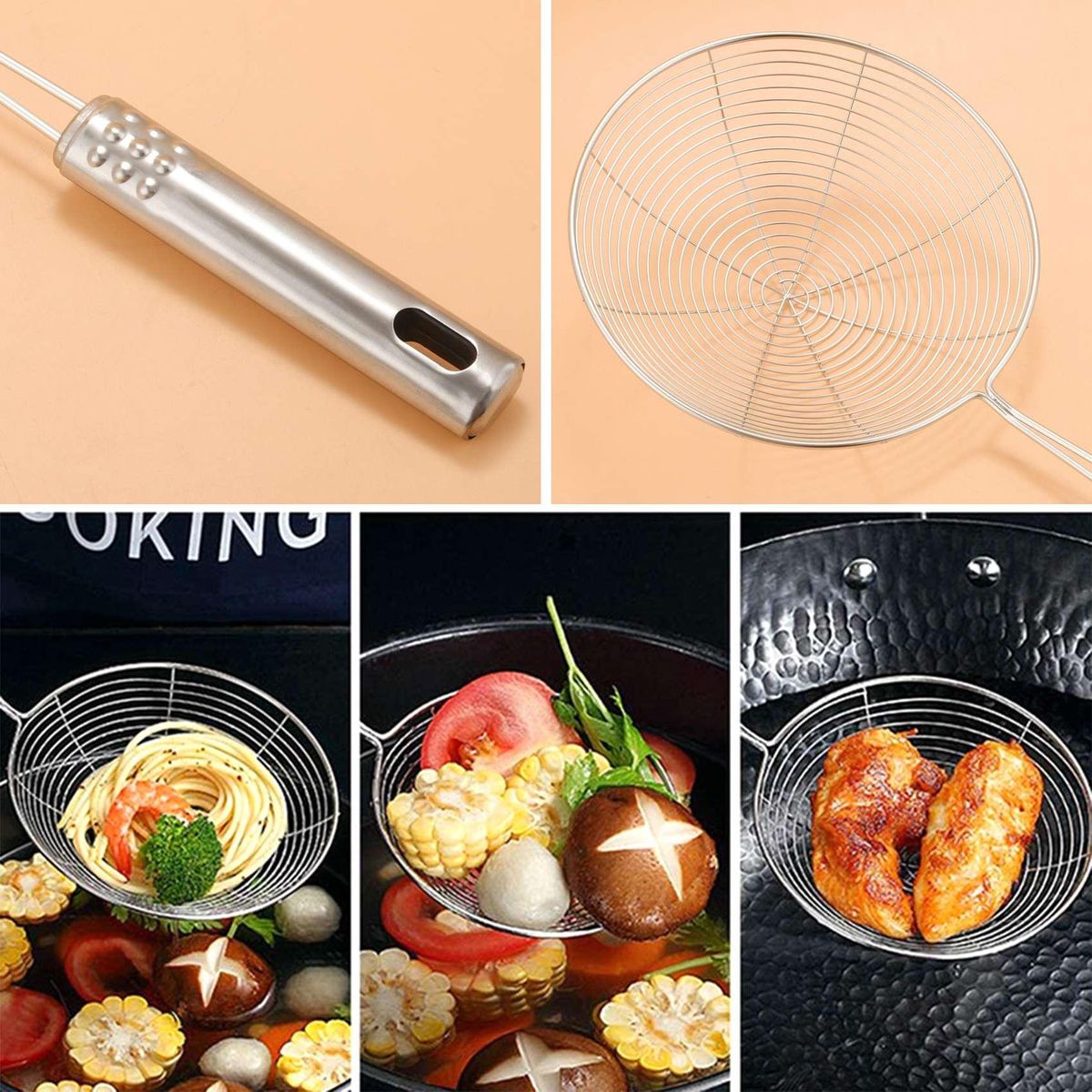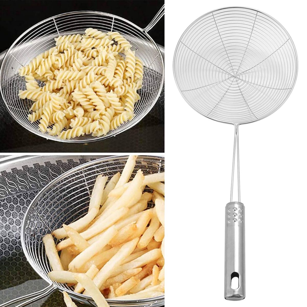 SKIMMER SPIDER STRAINER: The skimmer spoon helps you take food out of hot oil or water safely, catches food securely while releasing oil and and other residue. The spider spoon for deep frying is perfect for donut, french fries, fish, vegetables, pasta, meats, like potato chips, chicken legs, and scoop up noodles, spaghetti and more.