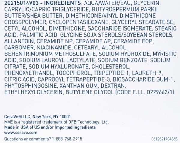 INGREDIENTS : AQUA / WATER / EAU, GLYCERIN, CAPRYLIC/CAPRIC TRIGLYCERIDE, BUTYROSPERMUM PARKII BUTTER / SHEA BUTTER, DIMETHICONE/VINYL DIMETHICONE CROSSPOLYMER, CYCLOPENTASILOXANE, GLYCERYL STEARATE SE, CETYL ALCOHOL, DIMETHICONE, SACCHARIDE ISOMERATE, STEARIC ACID, PALMITIC ACID, GLYCINE SOJA STEROLS / SOYBEAN STEROLS, ALLANTOIN, CERAMIDE NP, CERAMIDE AP, CERAMIDE EOP, CARBOMER, NIACINAMIDE, CETEARYL ALCOHOL, BEHENTRIMONIUM METHOSULFATE, SODIUM HYDROXIDE, MYRISTIC ACID, SODIUM LAUROYL LACTYLATE, SODIUM BENZOATE, SODIUM CITRATE, SODIUM HYALURONATE, CHOLESTEROL, PHENOXYETHANOL, TOCOPHEROL, TRIPEPTIDE-1, LAURETH-9, CITRIC ACID, CAPROOYL TETRAPEPTIDE-3, BIOSACCHARIDE GUM-1, PHYTOSPHINGOSINE, XANTHAN GUM, DEXTRAN, ETHYLHEXYLGLYCERIN, BUTYLENE GLYCOL