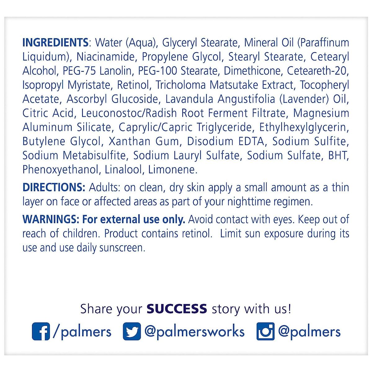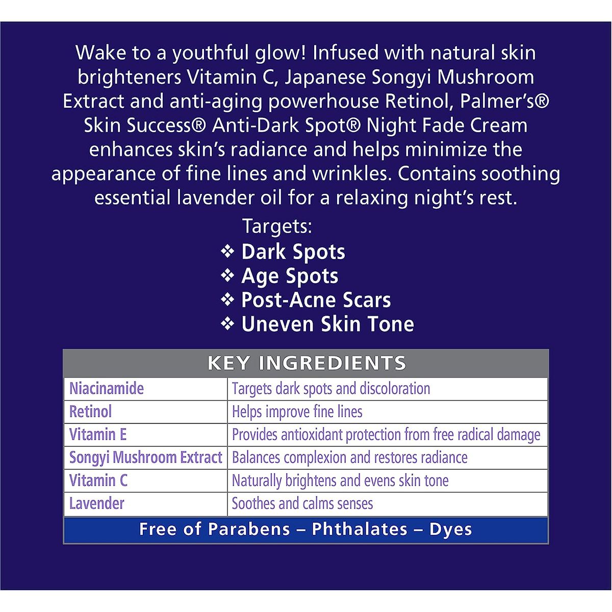 Wake to a youthful glow! Infused with natural skin brighteners Vitamin C, Japanese Songyi Mushroom Extract and anti-aging powerhouse Retinol, Palmer's® Skin Success® Anti-Dark Spot™ Night Fade Cream enhances skin's radience and helps minimize the apperance of fine lines and wrinkles. Contains soothing essential lavender oil for a relaxing nights rest.
