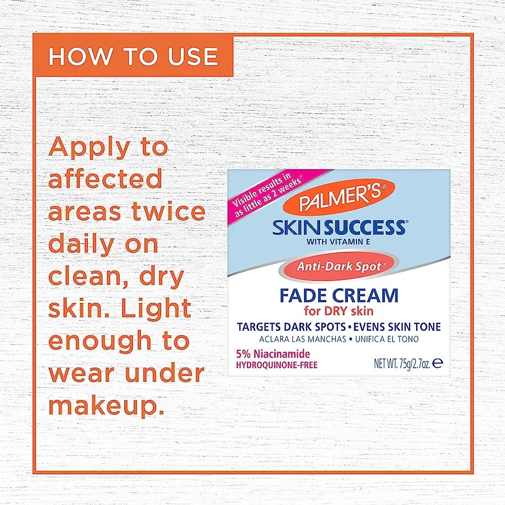 The wish list for skin is long for most people, as manywant to reduce the signs of aging, eliminate dryness, have soft, smooth and supple skin, and avoid worrying about dully, dry skin. Whether you're concerned about spots, dark marks, discoloration, or an uneven skin tone, you can fade dark marks naturally on your face and discover how to get an even skin tone on your body, too. So why not tackle those problems with products meant to produce a glowing complexion and brighter skin. A moisturizing fade cream or fade lotion is an integral part of the best regimen for glowing skin. Consistently applying a fade cream during both your morning and evening skin care routines is the best way to tackle dull, dry skin and dark spots. With versions available for normal, oily, or dry skin types, Palmer's Skin Success Anti-Dark Spot Face Cream balances uneven skin tone and discoloration. Now with 5% Niacinamide, and Free of Hydroquinone, Parabens, Phthalates, Sulfates, MI and Dyes, you can expect visible results in as little as 2 weeks