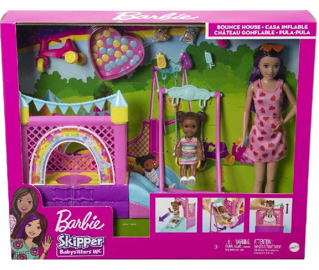 This Barbie Skipper Babysitters Inc. playset lets kids explore their nurturing side as the babysitter as they discover the ultimate day of play! Help Skipper doll care for toddler doll as she explores her very own personal playground featuring a rainbow-inspired bounce house, slide, swing, heart-shaped ball pit and tricycle. There's so much fun to be had! Skipper doll and toddler doll are ready for backyard fun in cute, casual outfits, and storytelling accessories inspire even more nurturing play. Kids ages 3 years old and up can collect other Babysitters Inc. dolls and accessories to fill a babysitting schedule full of fun! Each sold separately, subject to availability. Dolls cannot stand alone. Colors and decorations may vary.