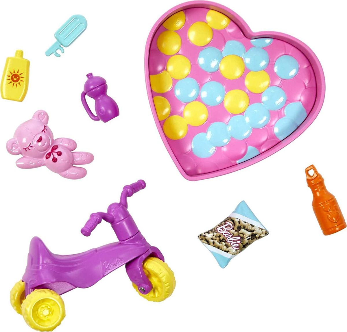 - Fun accessories, like sunglasses, snacks, sunblock and water bottles, inspire complete storytelling play.